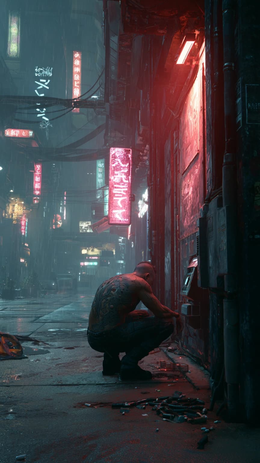 A close-up shot of a black market data thief, a young man in his late 20s with a...