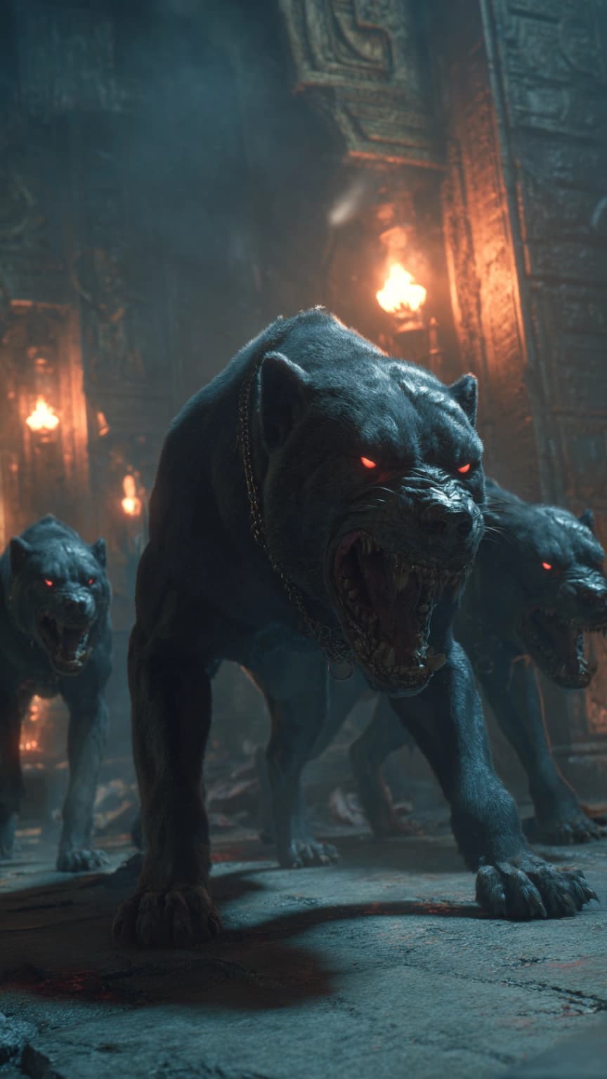 A close-up shot of Cerberus, the three-headed hound, guarding the entrance to th...