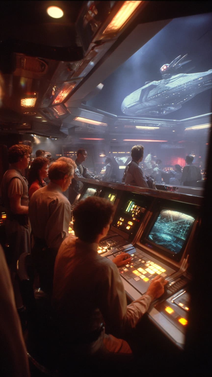 A cinematic scene unfolding on a starship bridge, with a dynamic camera capturin...