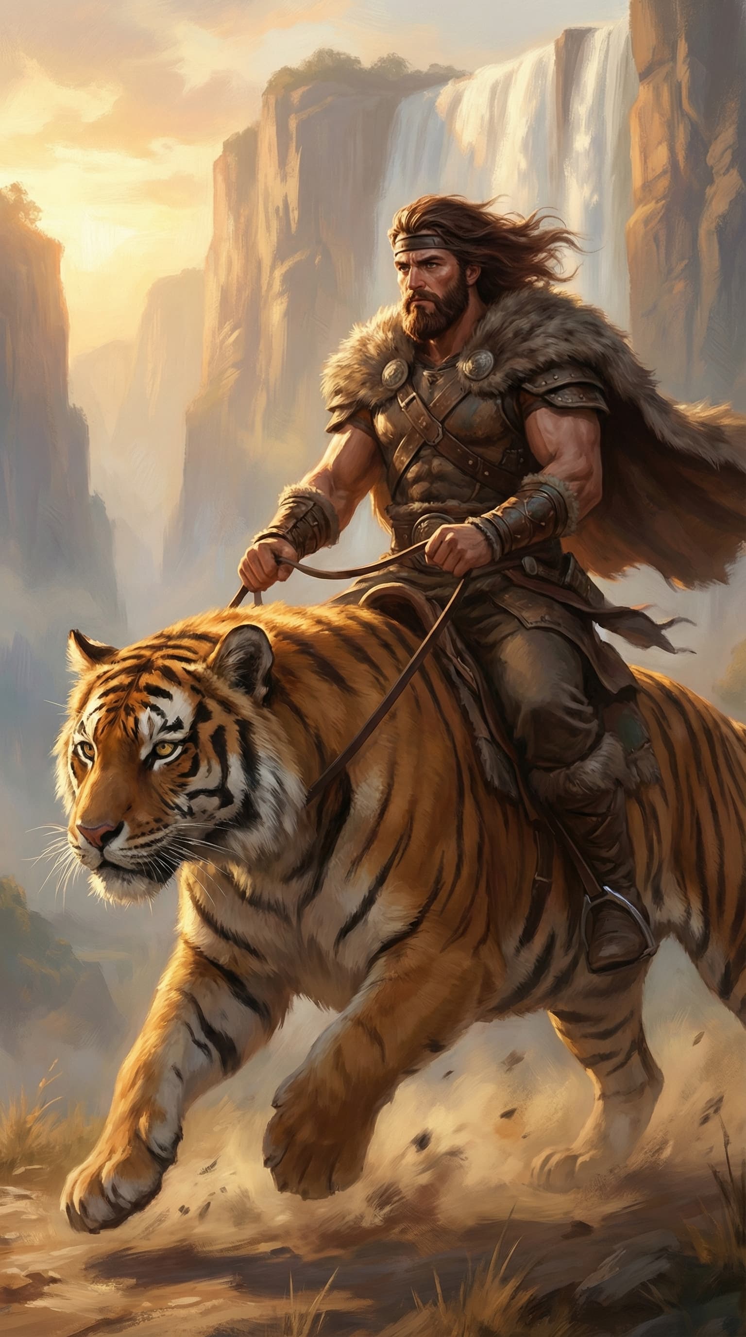 This image depicts a muscular warrior, clad in fur and leather armor, confidently riding a tiger. A misty landscape o...