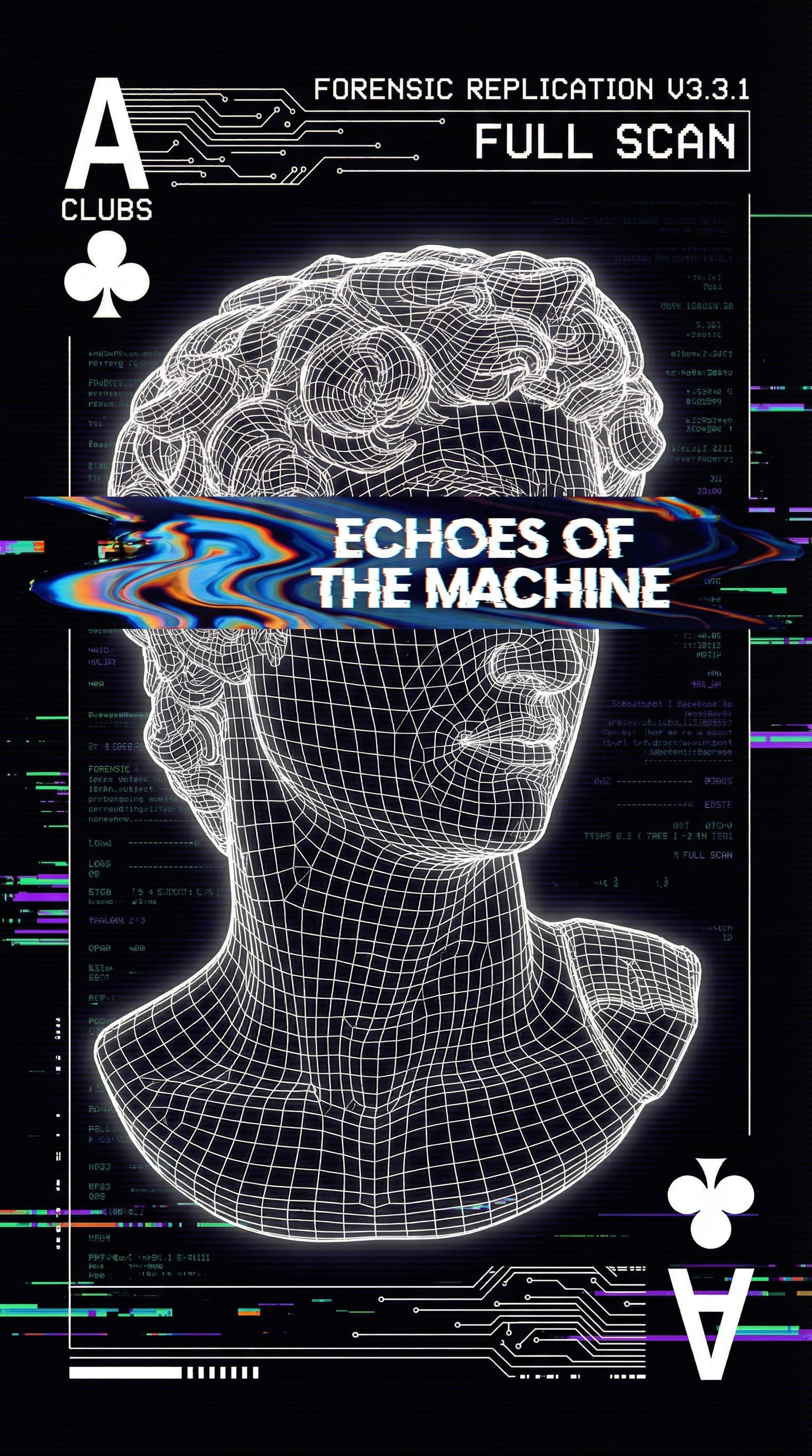 A wireframe bust of a classical sculpture floats amidst digital glitches and overlaid code. The image evokes a sense ...