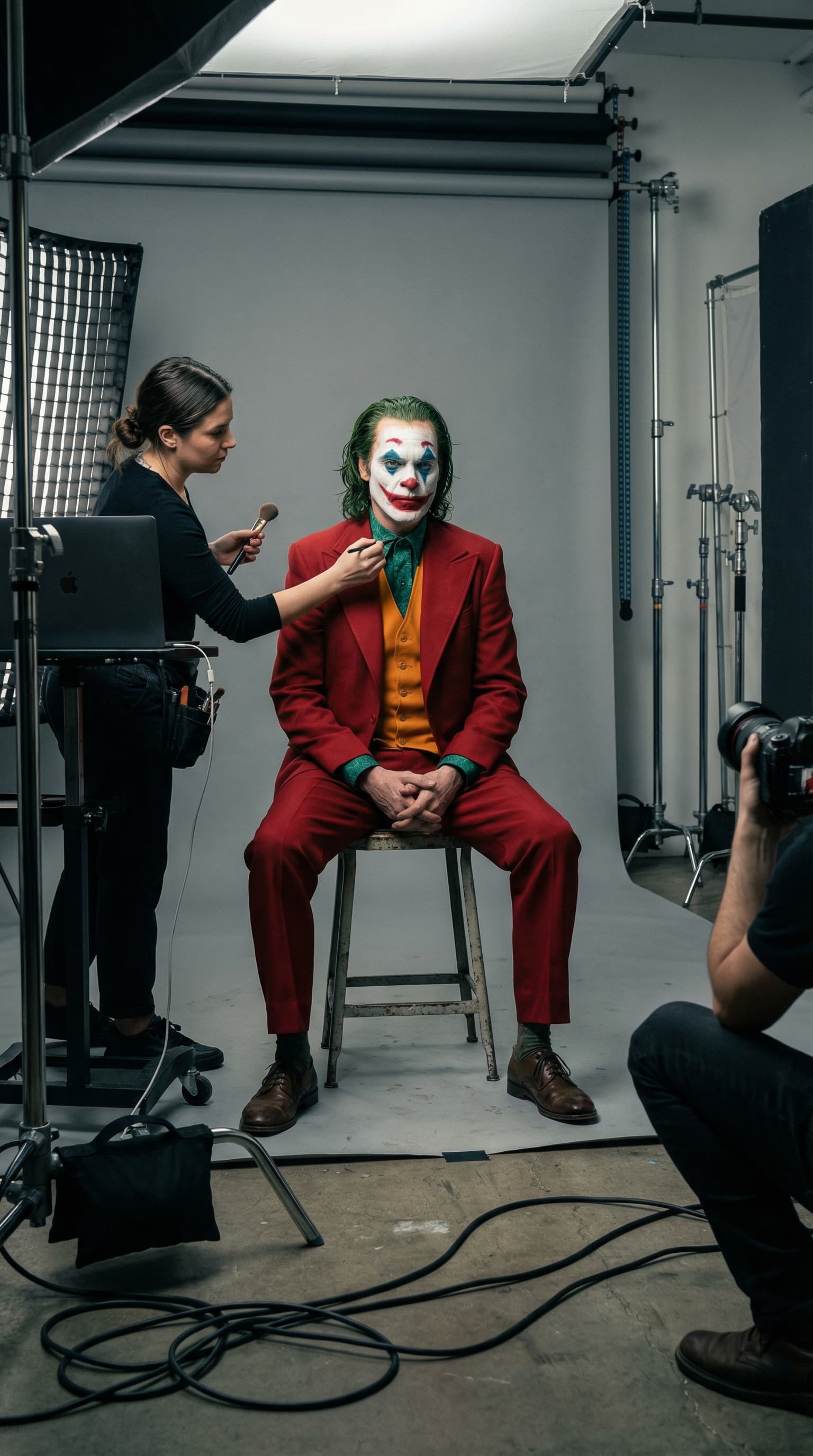A performer in clown makeup sits under the bright lights of a photography studio, as a makeup artist touches up his f...