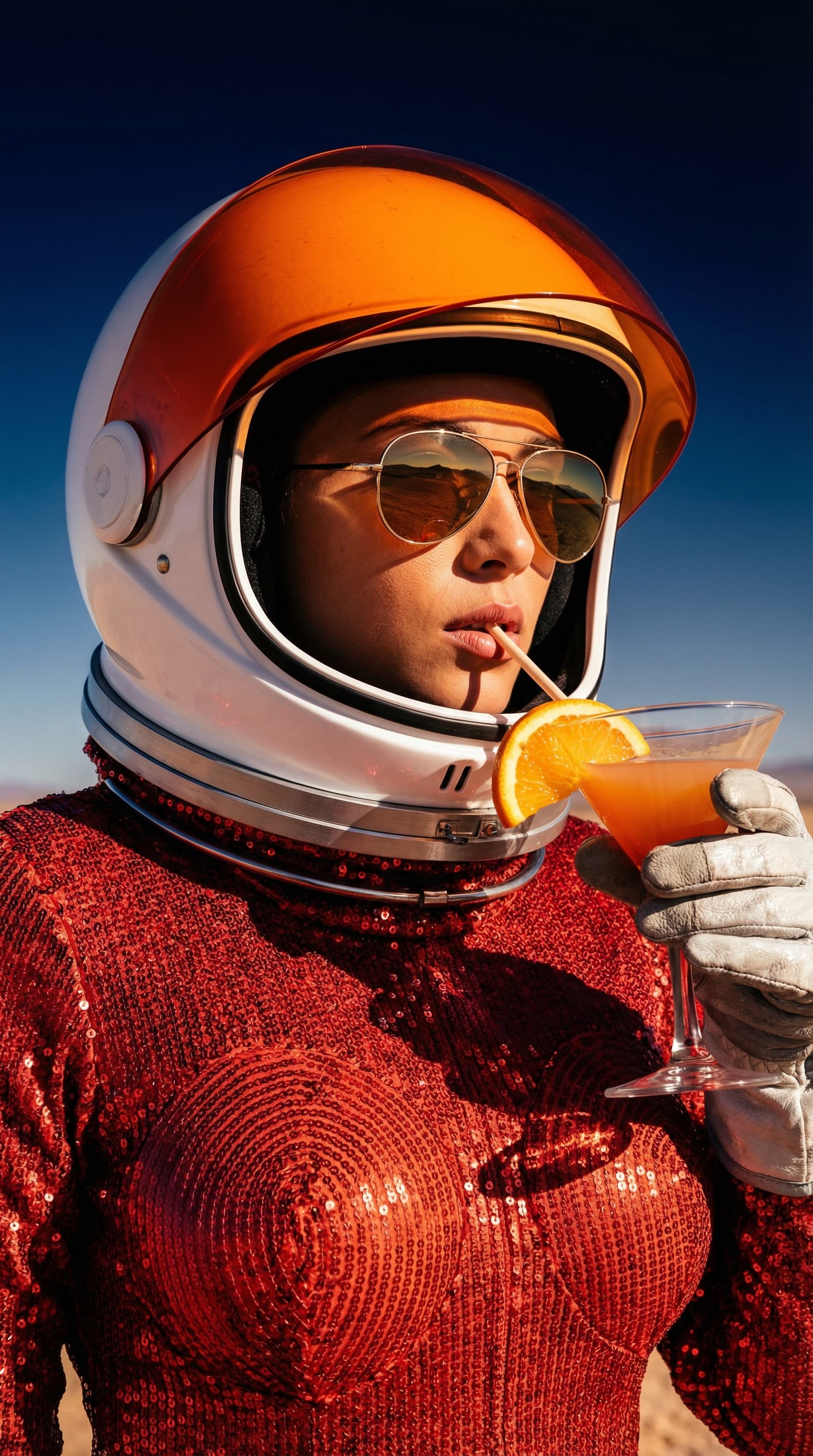 This image depicts an astronaut in full gear, yet with a modern twist. The astronaut sips a cocktail garnished with a...