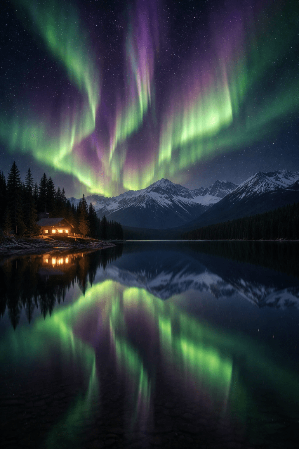 Northern lights dancing across the night sky above calm mountain lake, green and...