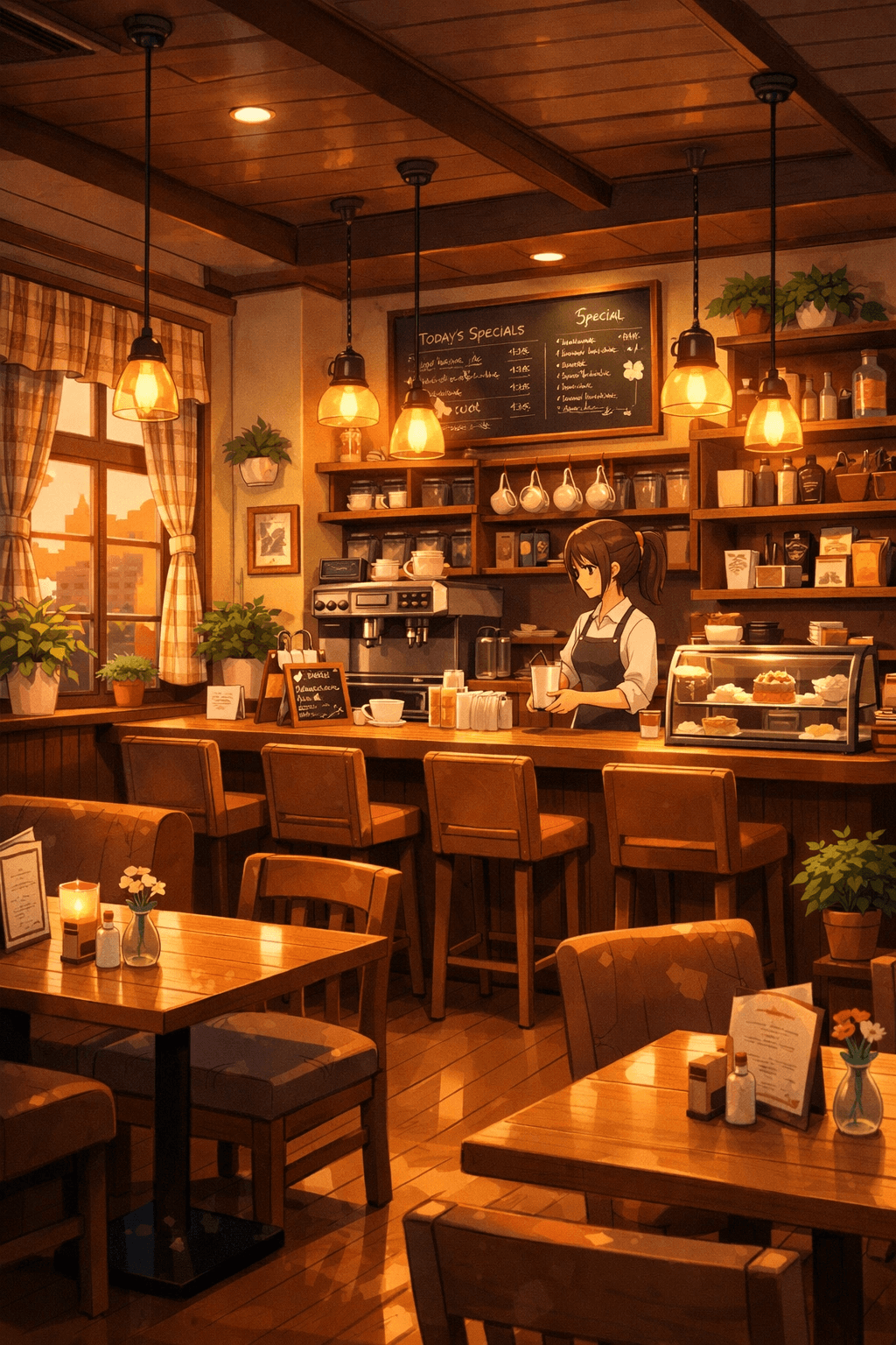Stylized anime café interior, cozy lighting, slice-of-life aesthetic.