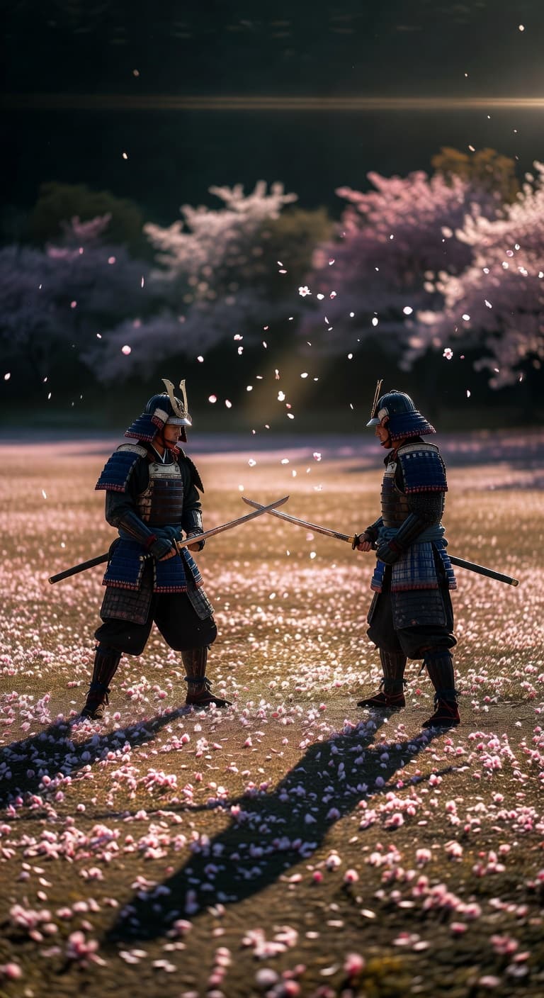 Two samurai warriors face each other with drawn swords amidst falling cherry blossoms. The composition evokes a sense...