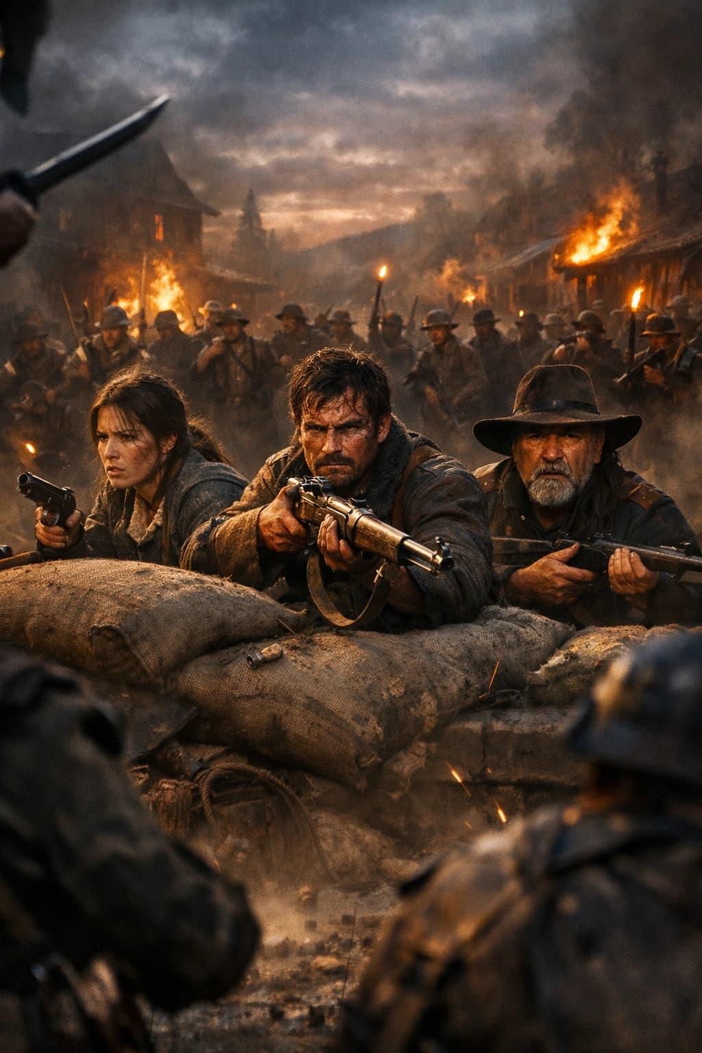 In a war-torn landscape, determined figures huddle behind sandbags, their rifles poised amidst smoke and fire. The dr...