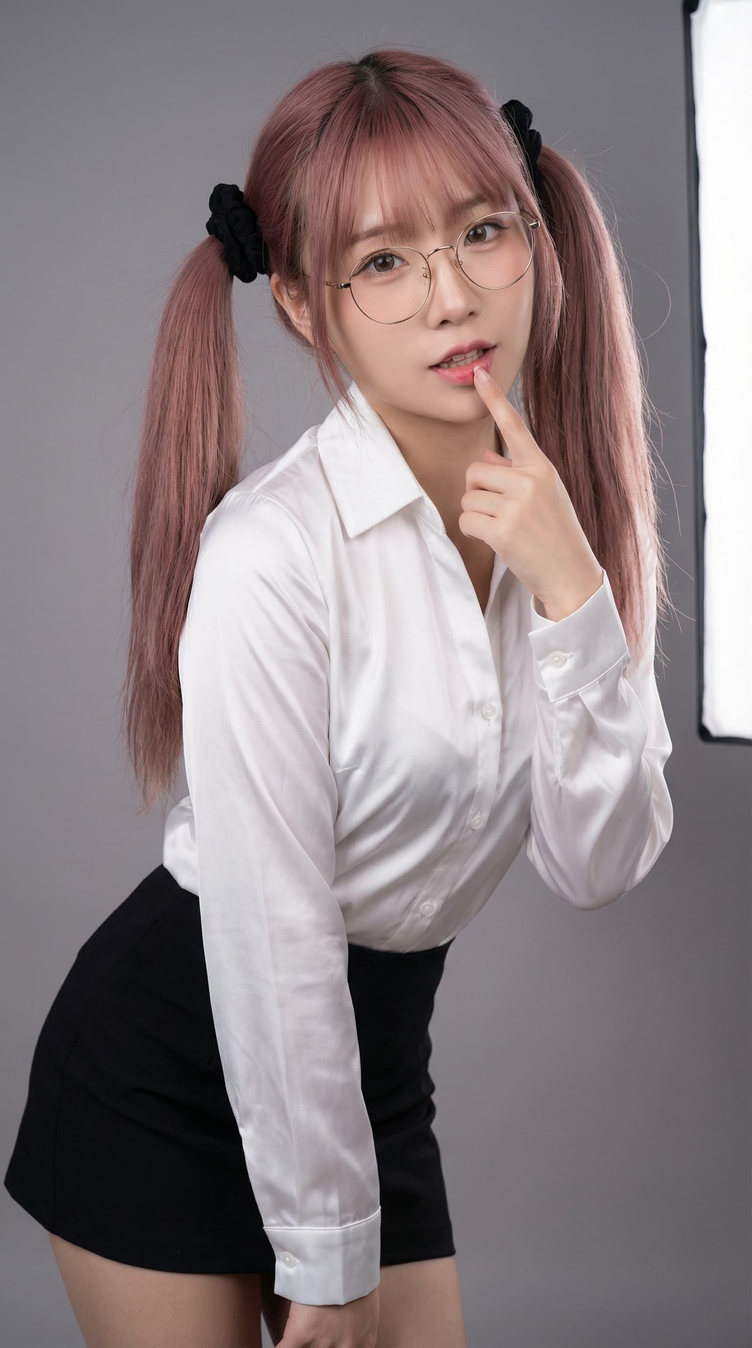 A young woman with pink hair and round glasses poses in a white blouse and black skirt. The image is softly lit, capt...