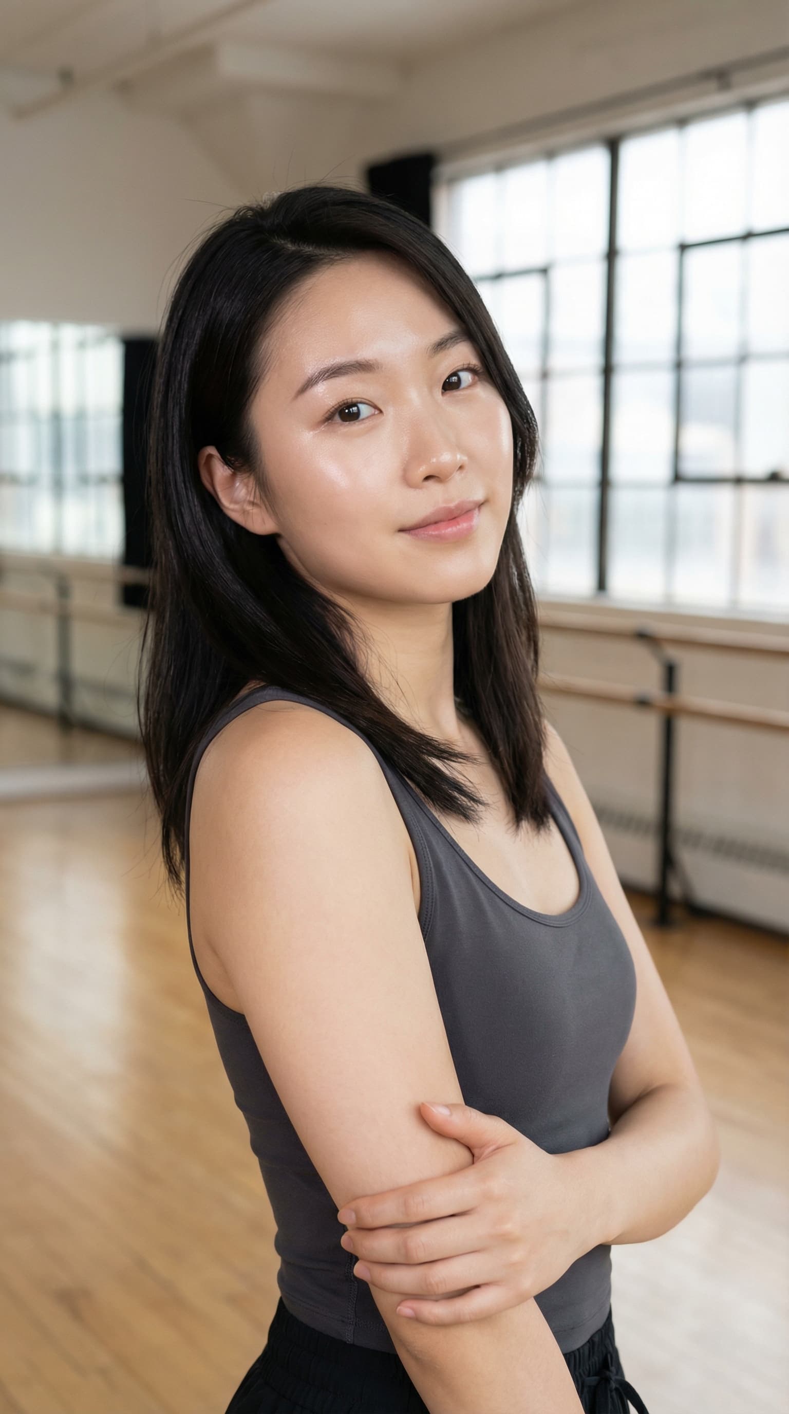 A young woman stands in a sunlit dance studio, her arms crossed. The image has a serene and contemplative mood, rende...