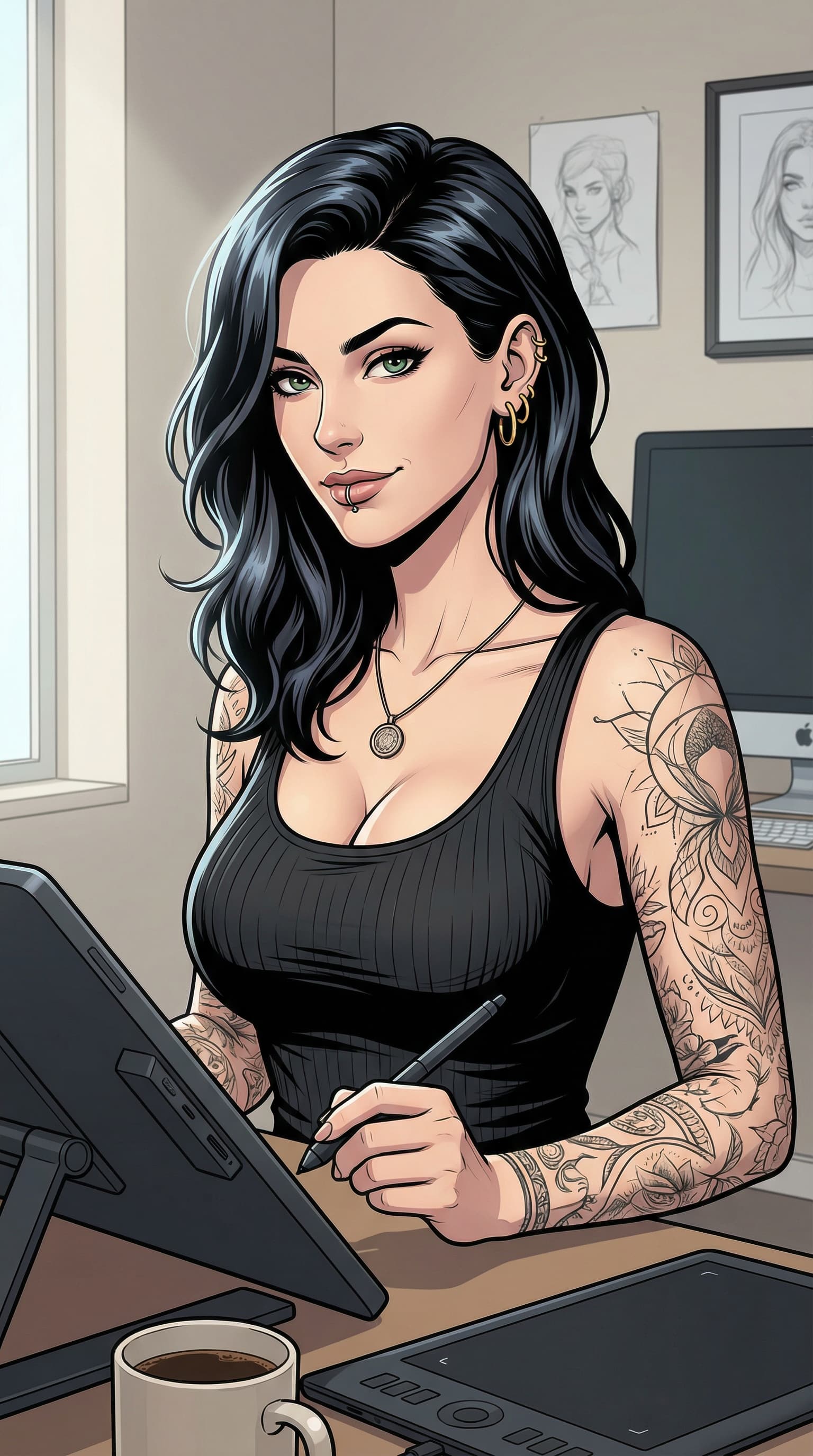 A digital artist works at her drafting table, pen in hand, with the calm focus of creation. Her style blends realism ...
