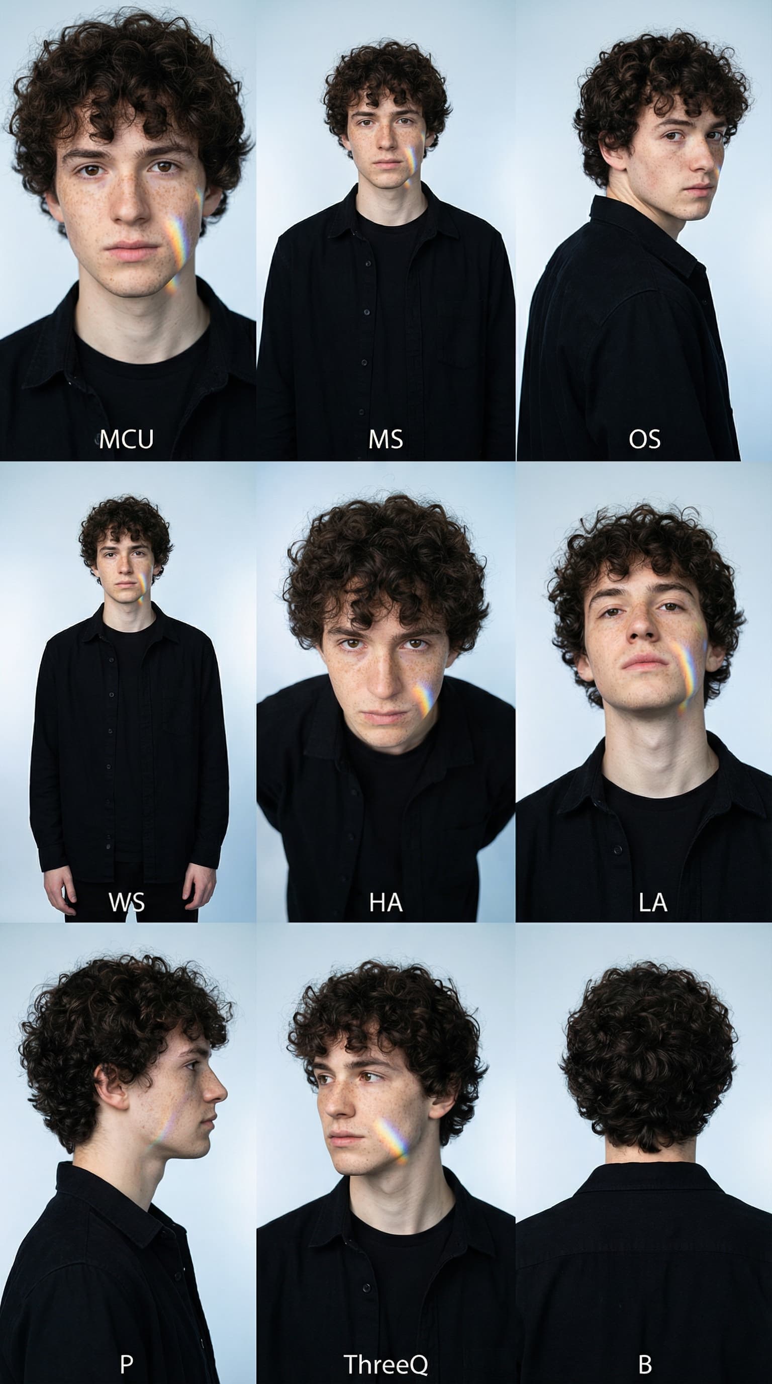 A young man with curly hair and freckles is presented in a series of portrait compositions against a cool, neutral ba...