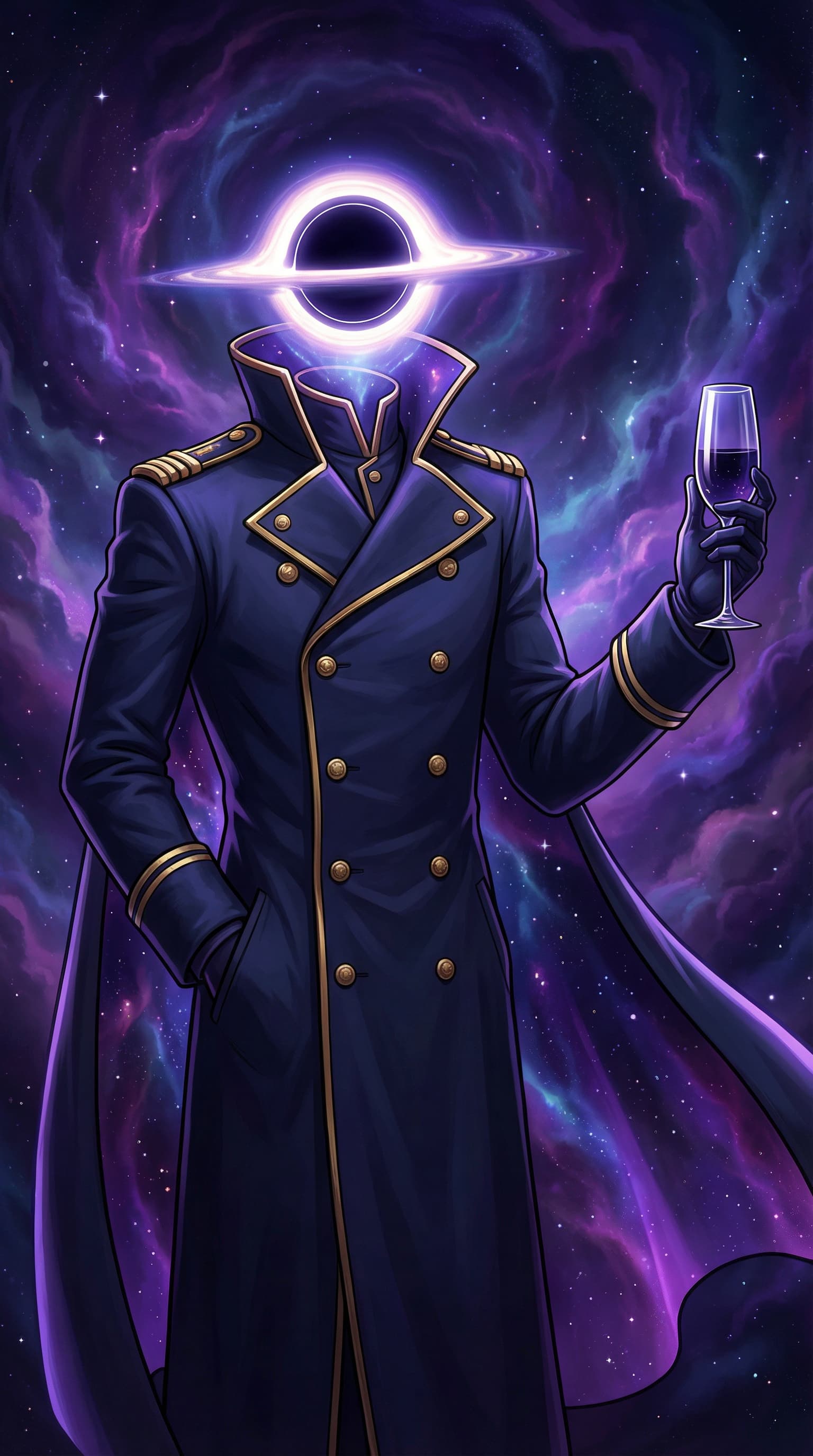 A stately figure in a naval coat holds a glass of dark wine against a backdrop of swirling cosmic clouds. In place of...