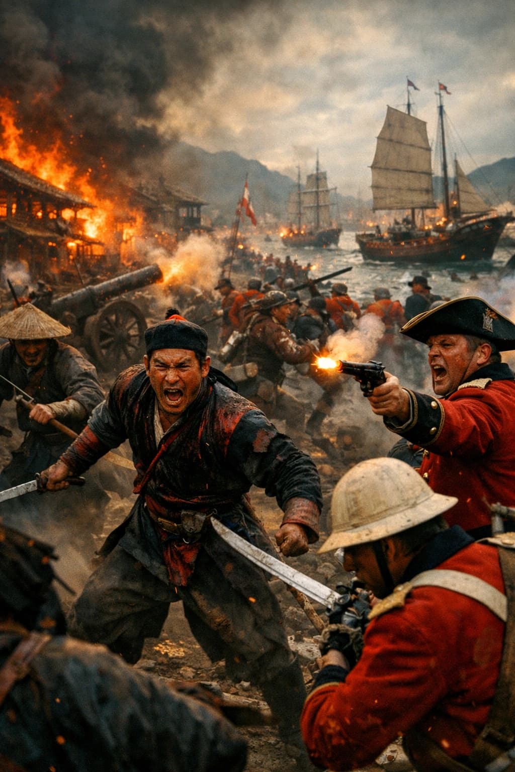 This dynamic scene depicts a fierce battle between British soldiers and Chinese warriors amidst a burning coastal vil...