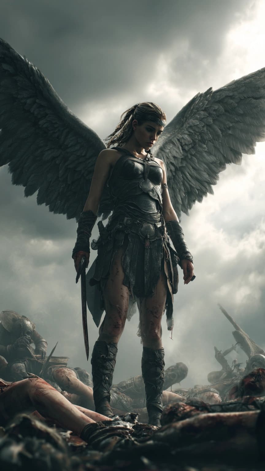 A battle-weary Valkyrie descends from the sky, her wings beating fiercely as she...