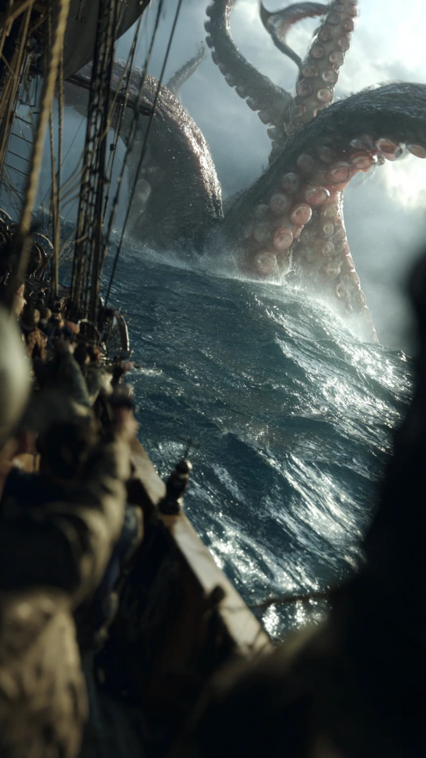 A dynamic and cinematic scene unfolds as a massive sea monster, the Kraken, brea...