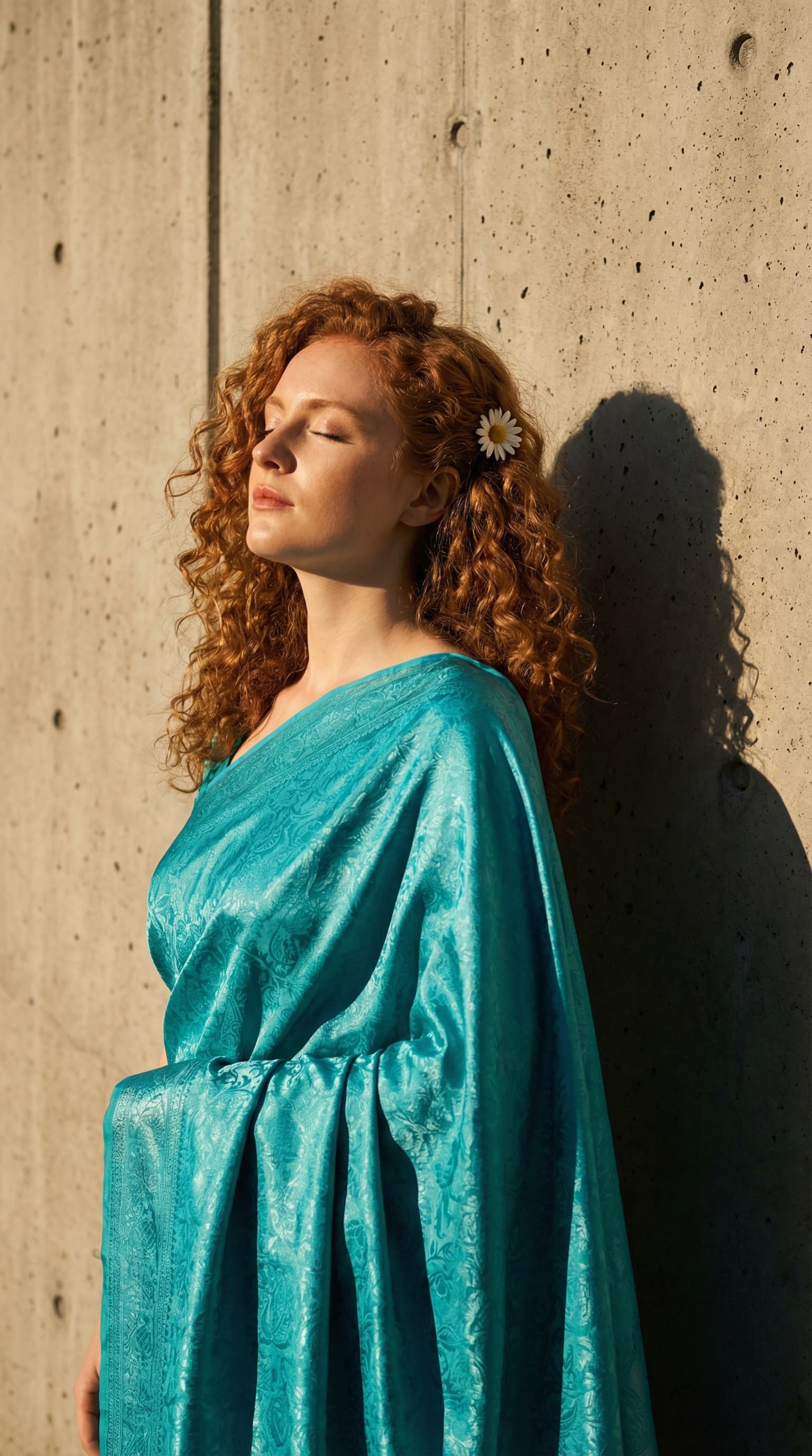 A woman with striking red curls and a daisy in her hair stands bathed in sunlight against a textured concrete wall. D...
