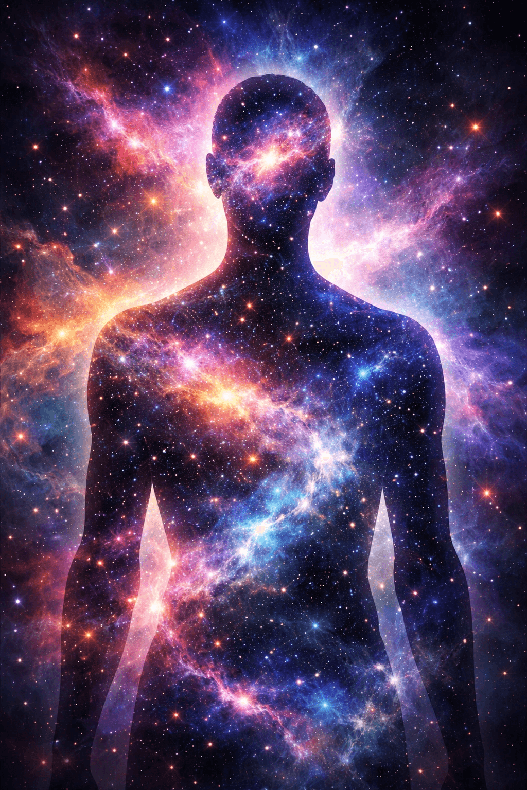 Surreal digital art of a human silhouette filled with galaxies and stars.