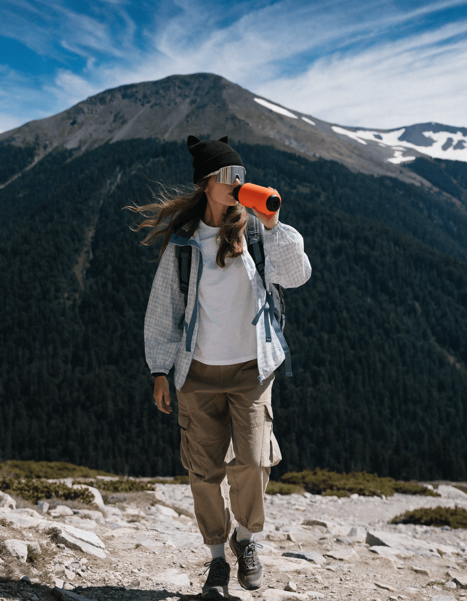 A hiker in a playful cat-ear hat and futuristic glasses pauses for a drink against the b...