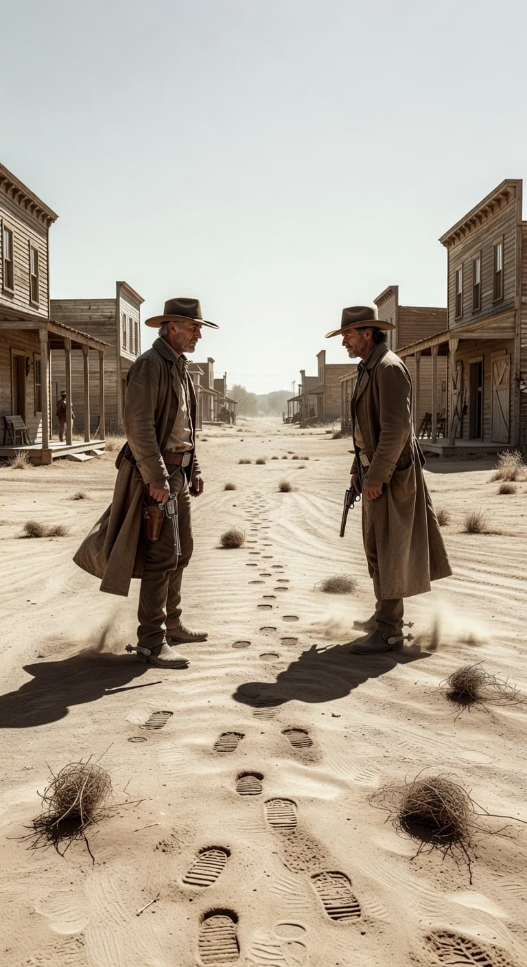 Two gunslingers face off at high noon on a dusty, deserted main street. The vintage Western scene evokes a sense of t...