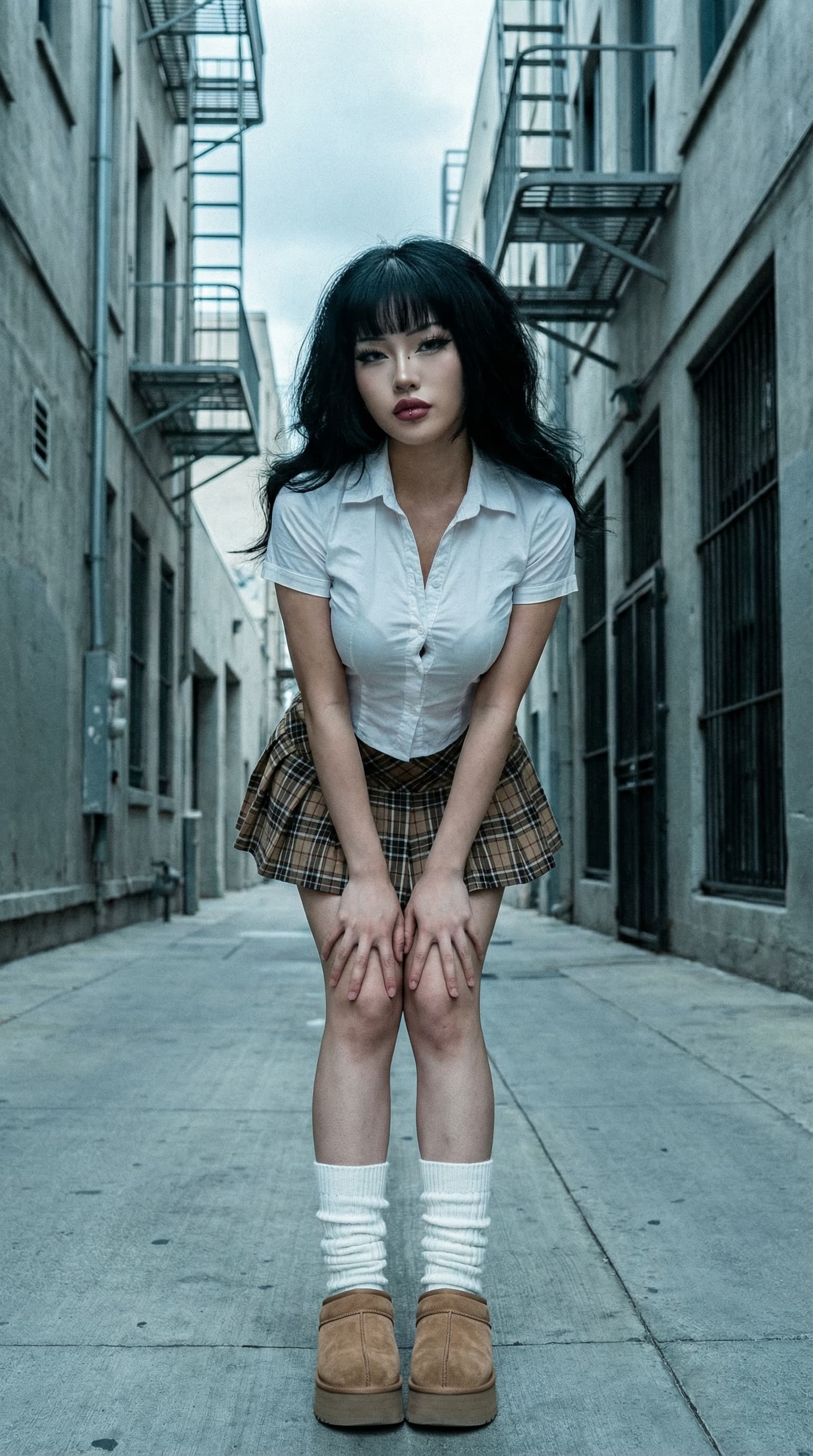 A young woman in a school uniform poses in a narrow urban alleyway. The composition emphasizes the stark contrast bet...