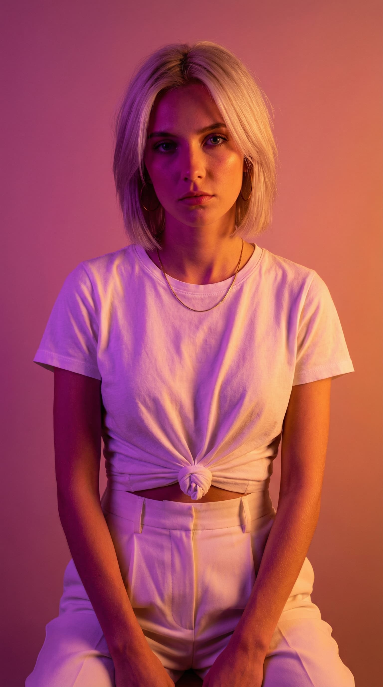 An elegant young woman with platinum blonde hair is depicted in this portrait. Bathed in a warm gradient of magenta a...