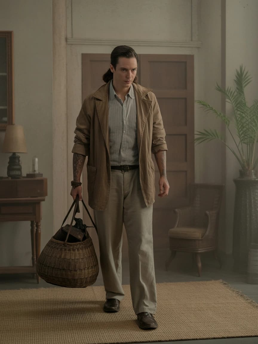 A man in a linen suit walks through a dimly lit, vintage-style room, carrying a basket overflowing with dark objects....