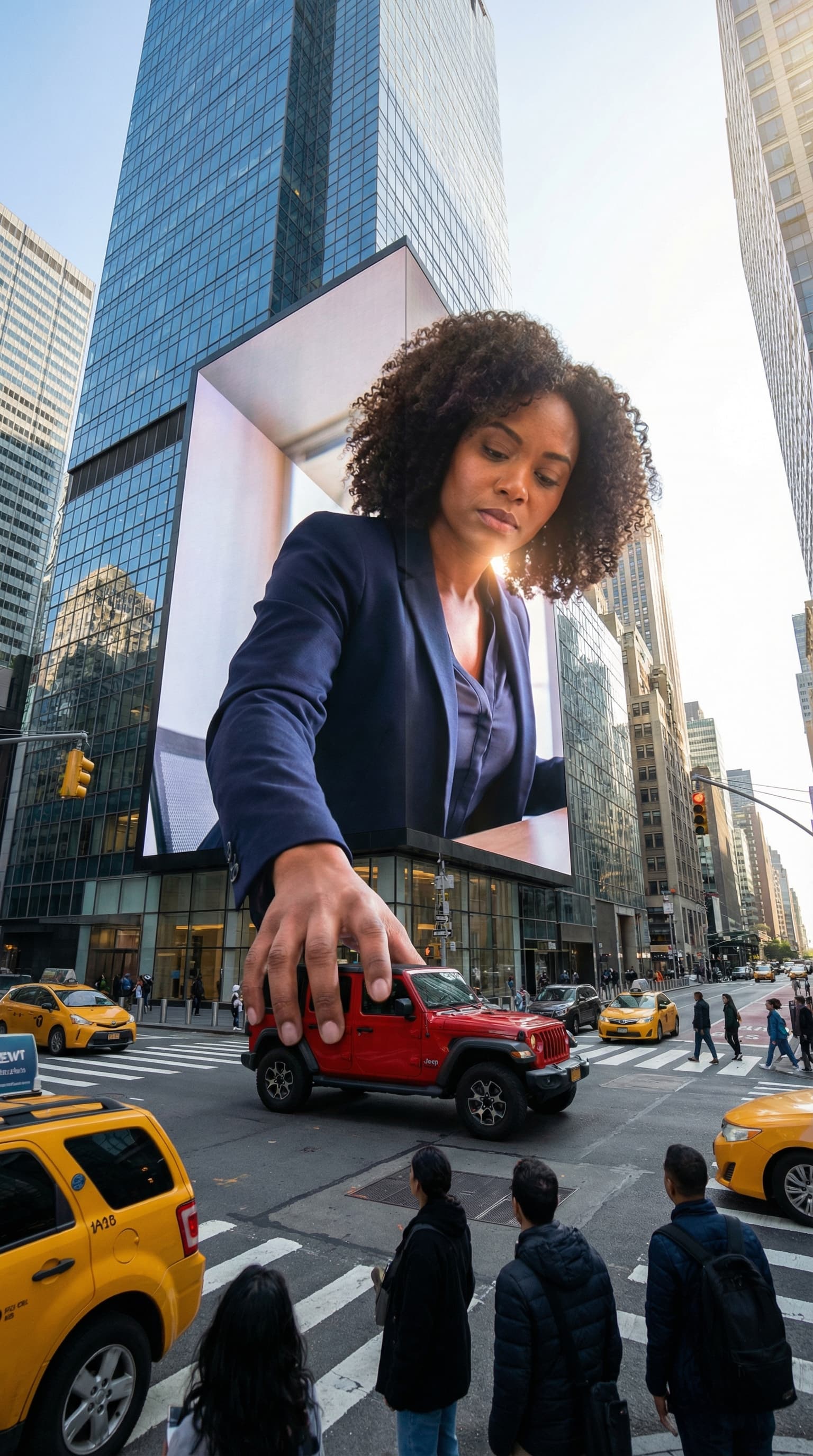 This image presents a surreal scene in a busy New York City intersection. A giant woman in business attire appears to...