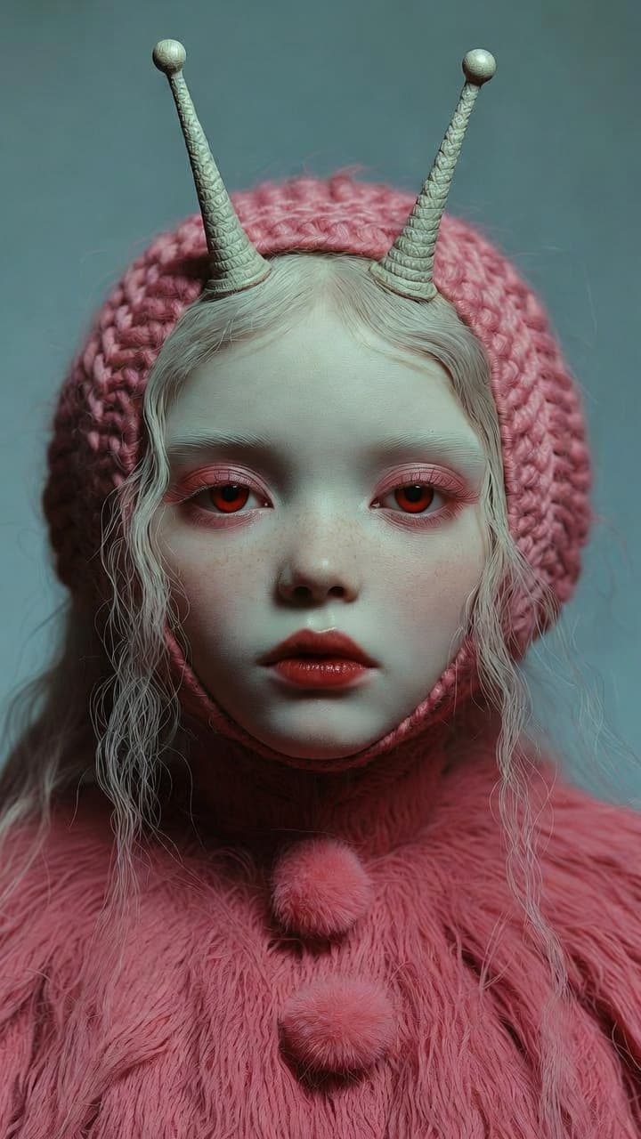 This unsettling portrait depicts a pale, ethereal being adorned with pink knitted clothing and otherworldly antennae....