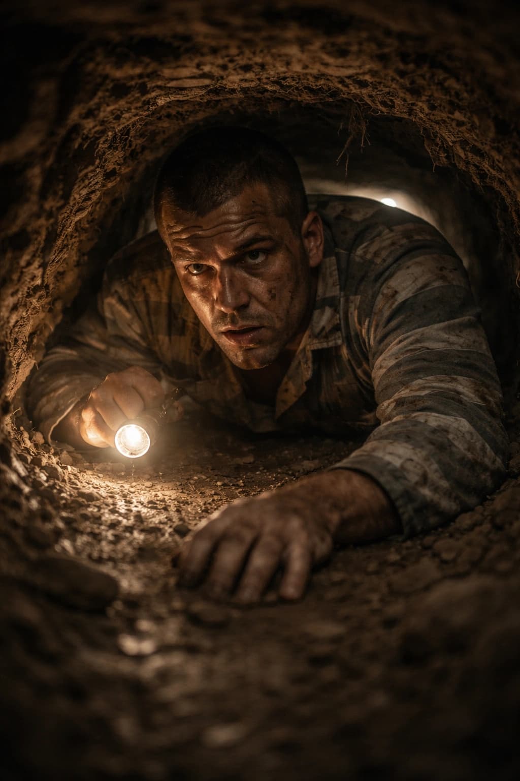 A man in prison garb crawls through a claustrophobic earthen tunnel, his flashlight beam illuminating the tight space...