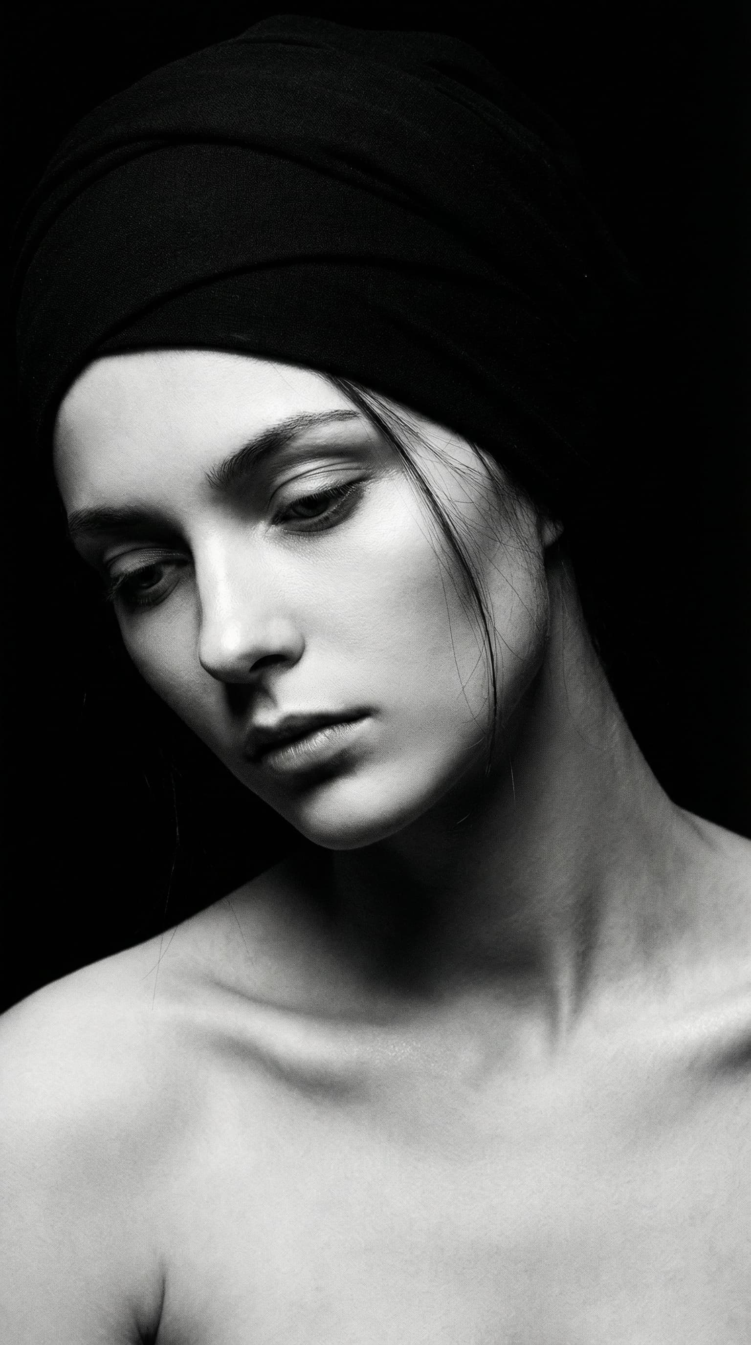 This striking monochrome portrait features a young woman with a contemplative gaze, her head draped in a dark, softly...