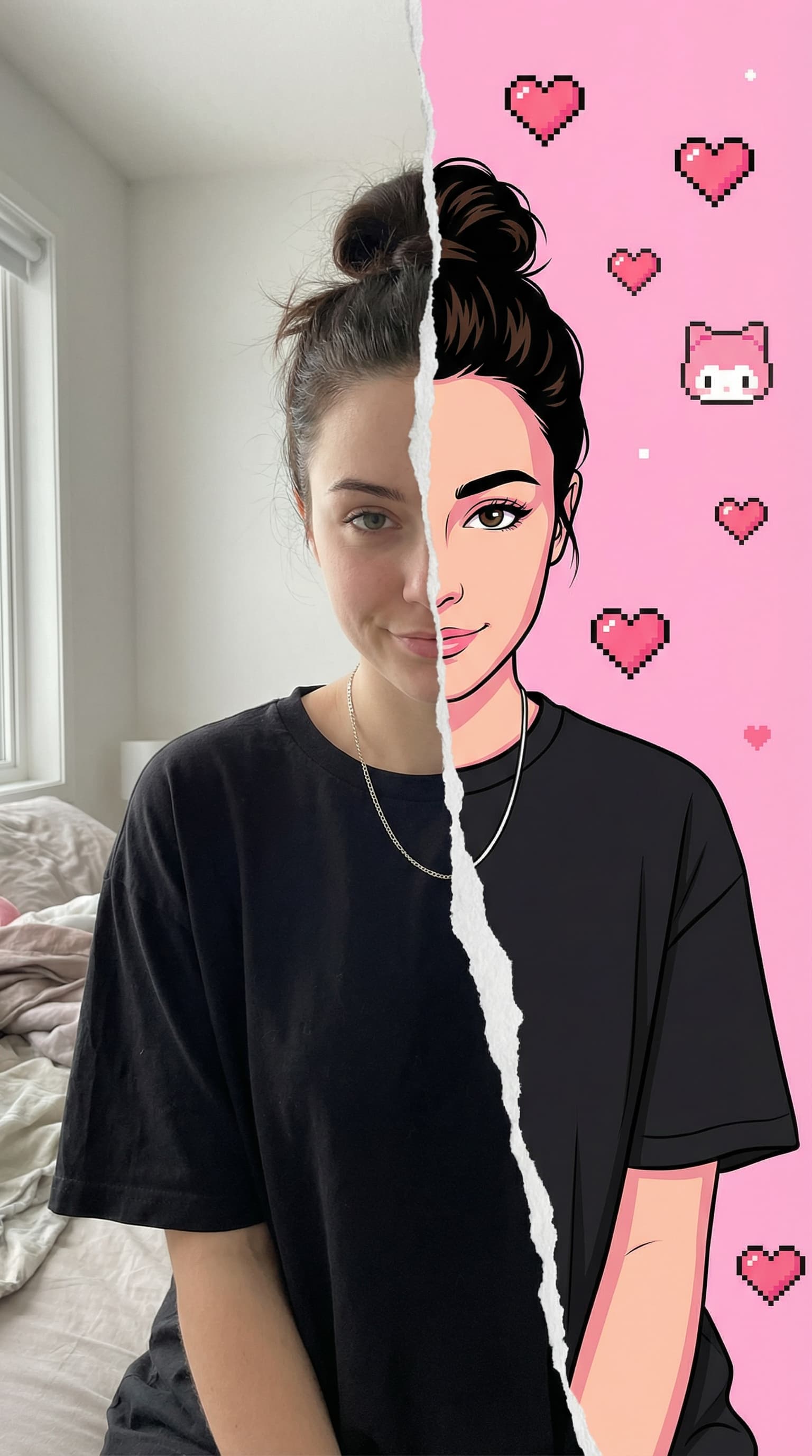This piece presents a woman split between reality and a cartoon self. The torn paper effect reveals her transformed i...