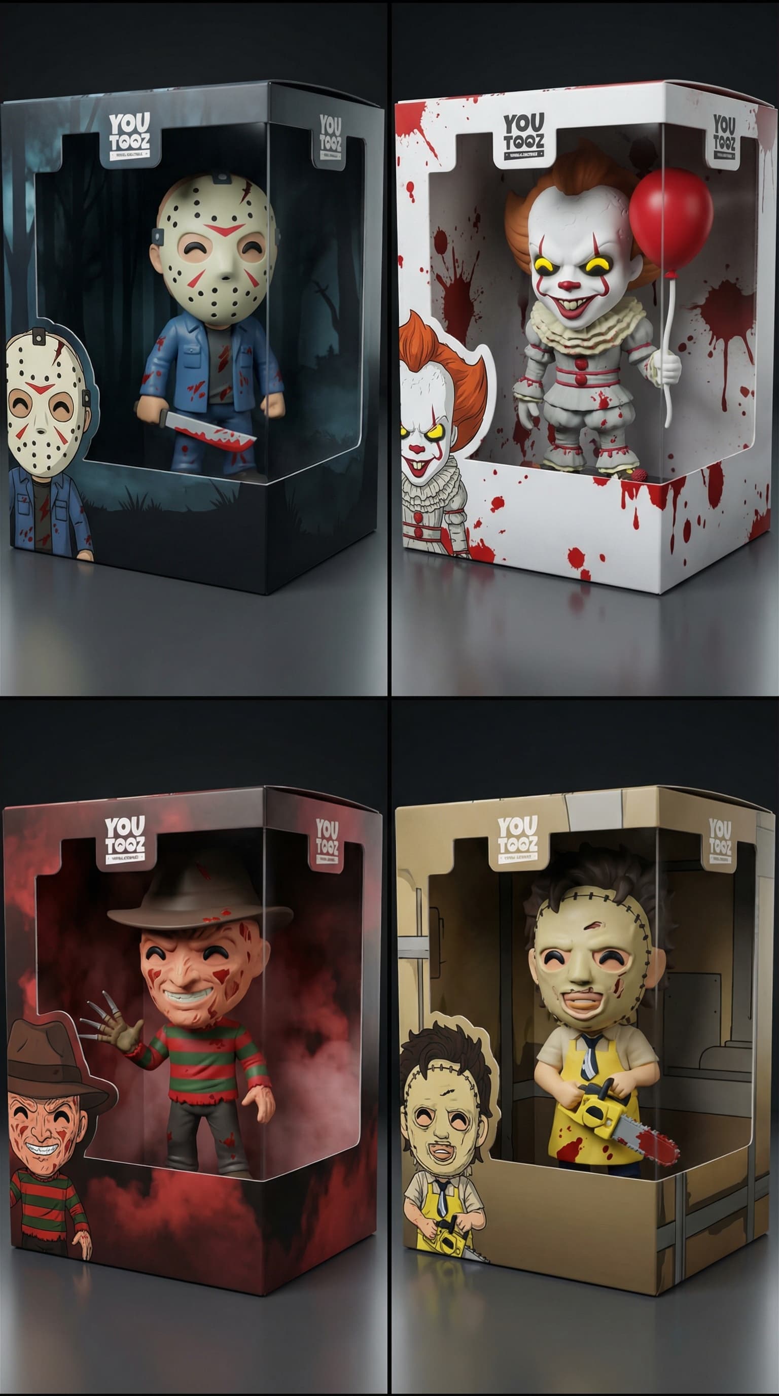 This image showcases a collection of stylized collectible figurines of famous horror movie characters. Each character...