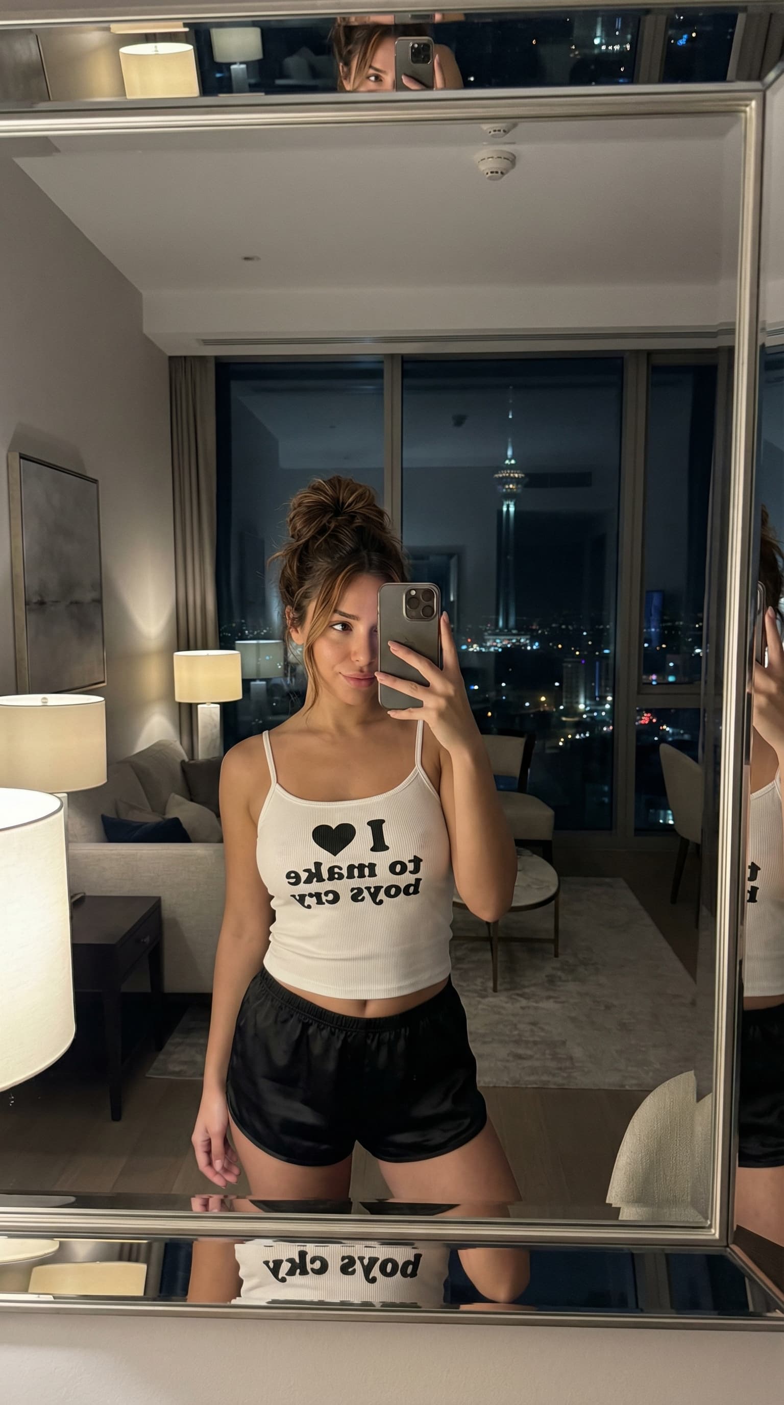 A young woman poses for a selfie in a modern, high-rise apartment with a dramatic city view at night. The image has a...