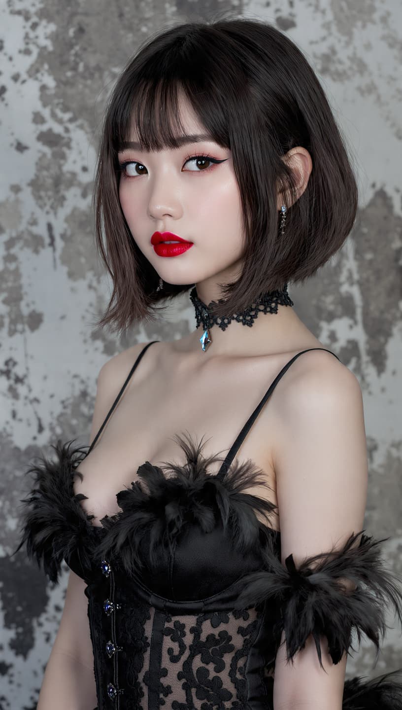 An elegant woman in a black corset with feather trim poses against a textured gray wall. The portrait emphasizes her ...