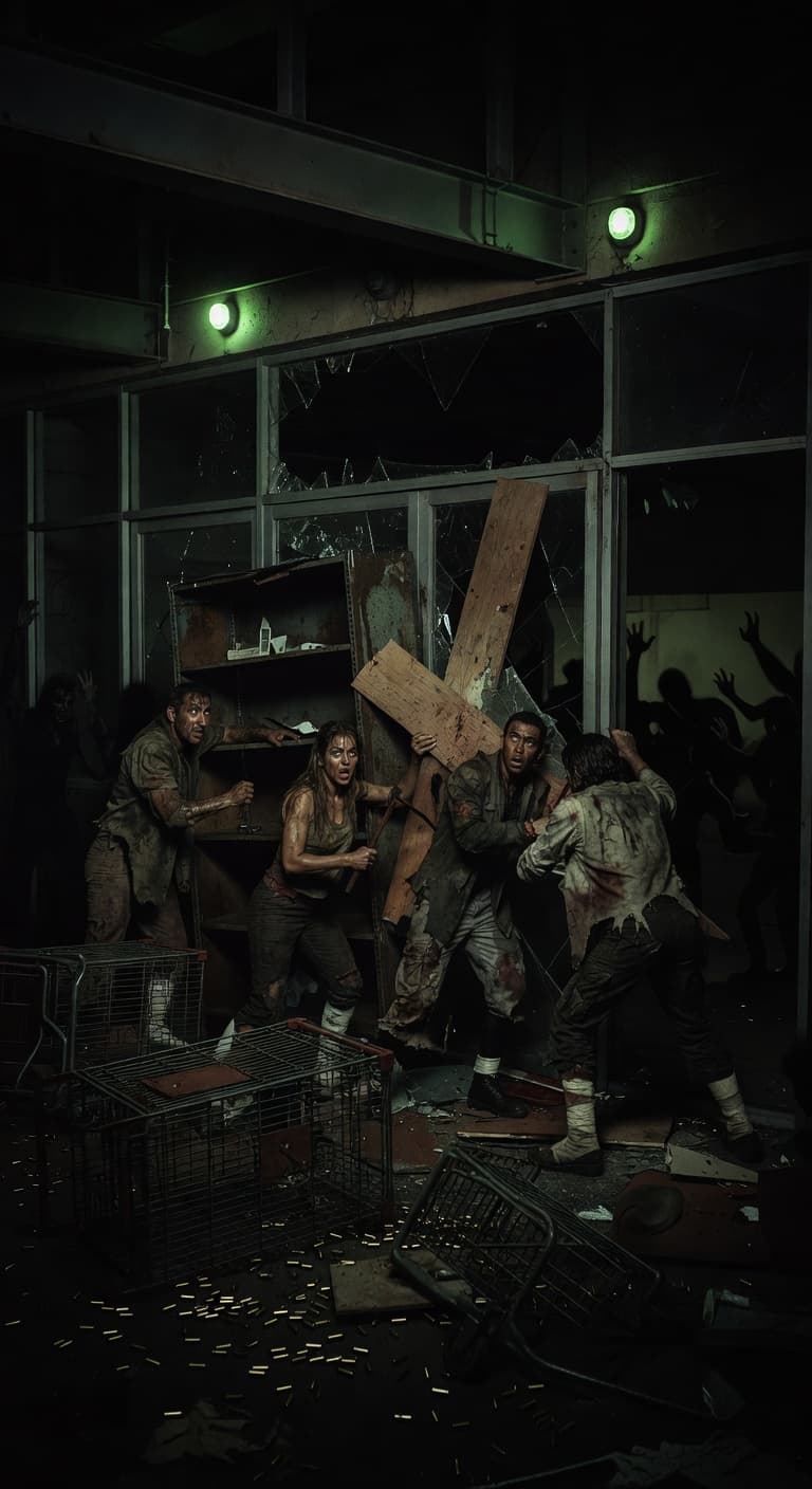 In a dimly lit, post-apocalyptic setting, a group of survivors desperately barricades a shattered storefront against ...