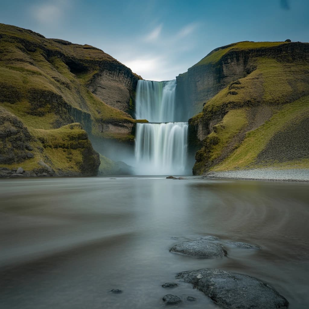 Majestic waterfalls cascade between verdant cliffs under a cloudy sky. The long exposure lends a soft, ethereal quali...
