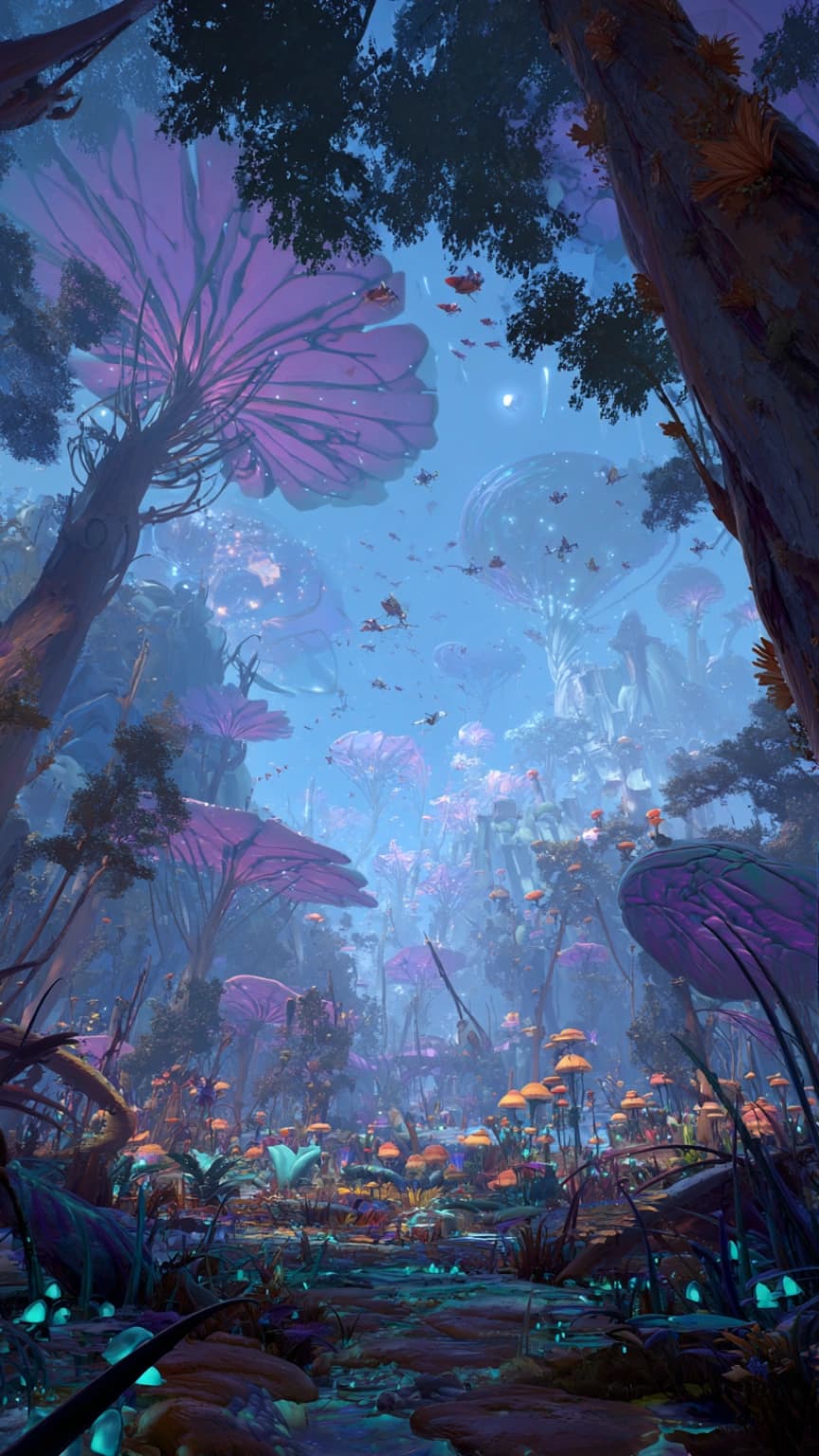 A vibrant, wide-angle shot of a dense jungle interior on Darwin-VII, showcasing ...