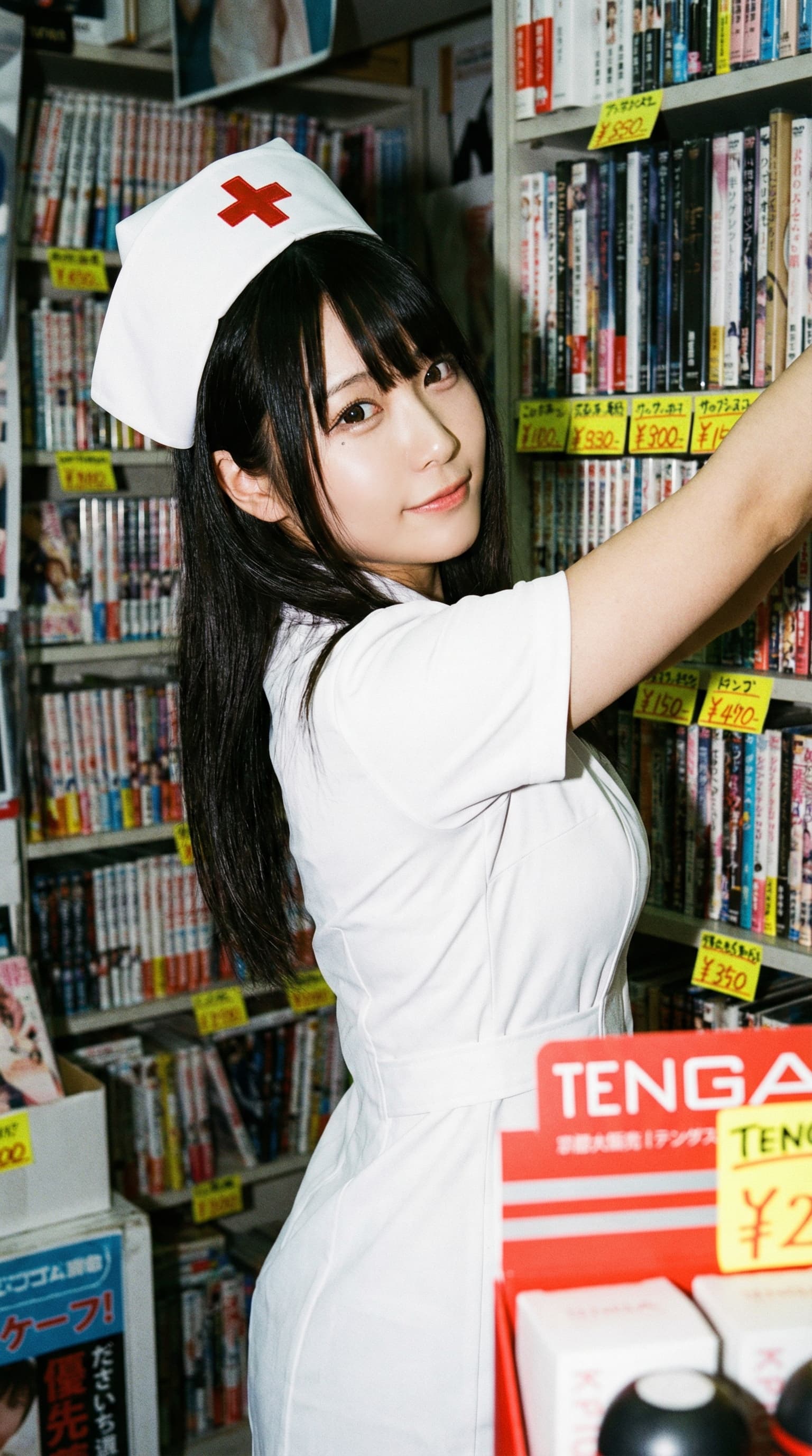 An Asian woman in a nurse's uniform smiles suggestively at the viewer. She stands amongst shelves packed with books a...