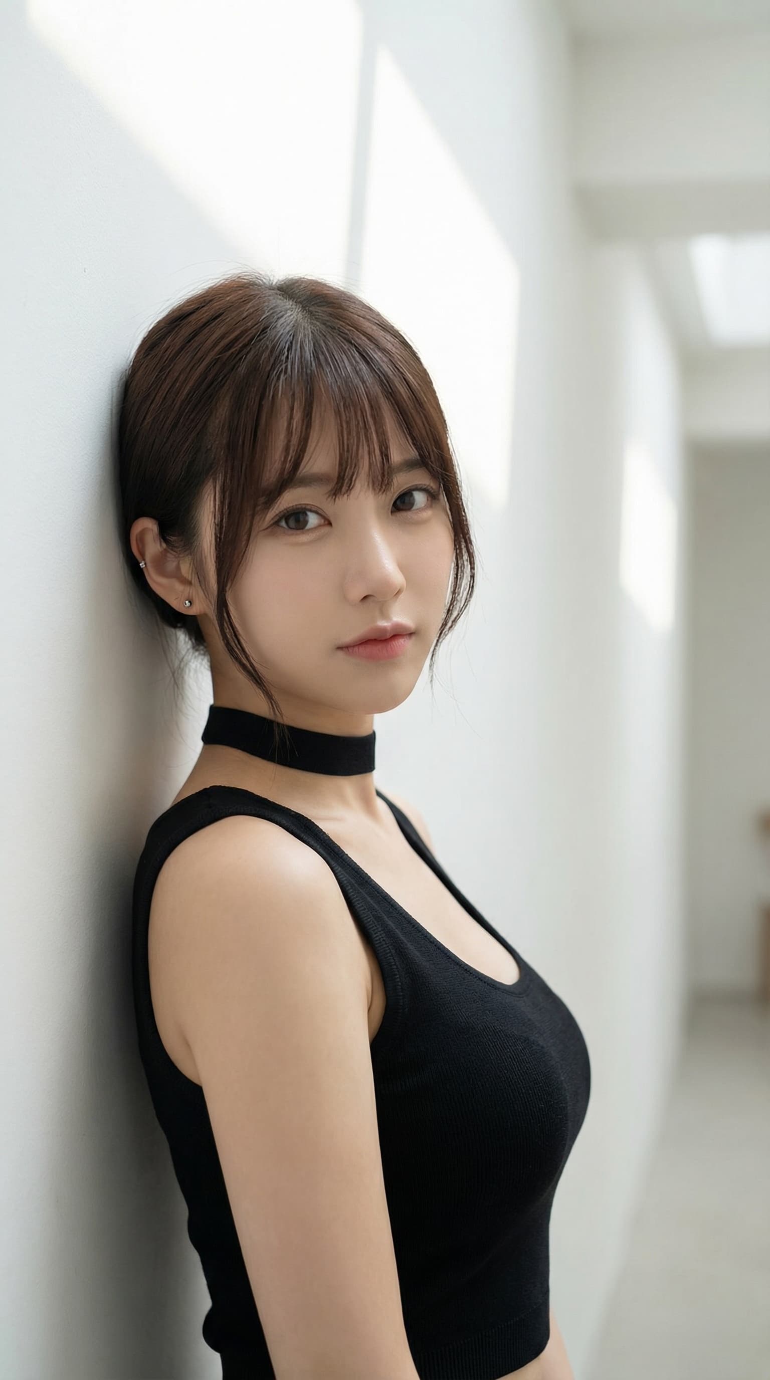 In this softly lit portrait, a young woman with bangs and a black tank top leans against a white wall. The light and ...