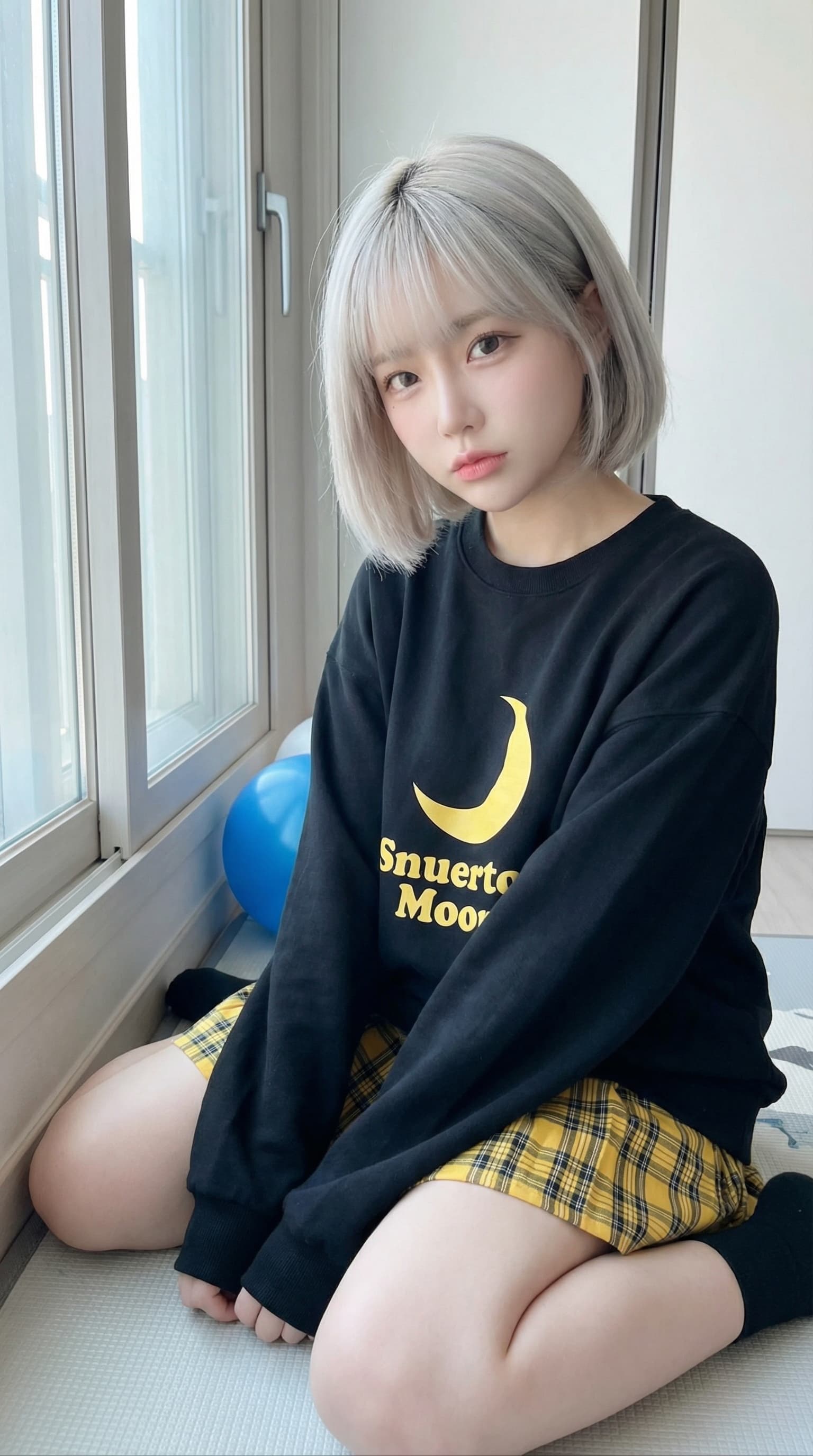 A young woman with silver hair sits by a bright window in a moment of quiet contemplation. The soft, pastel-like rend...