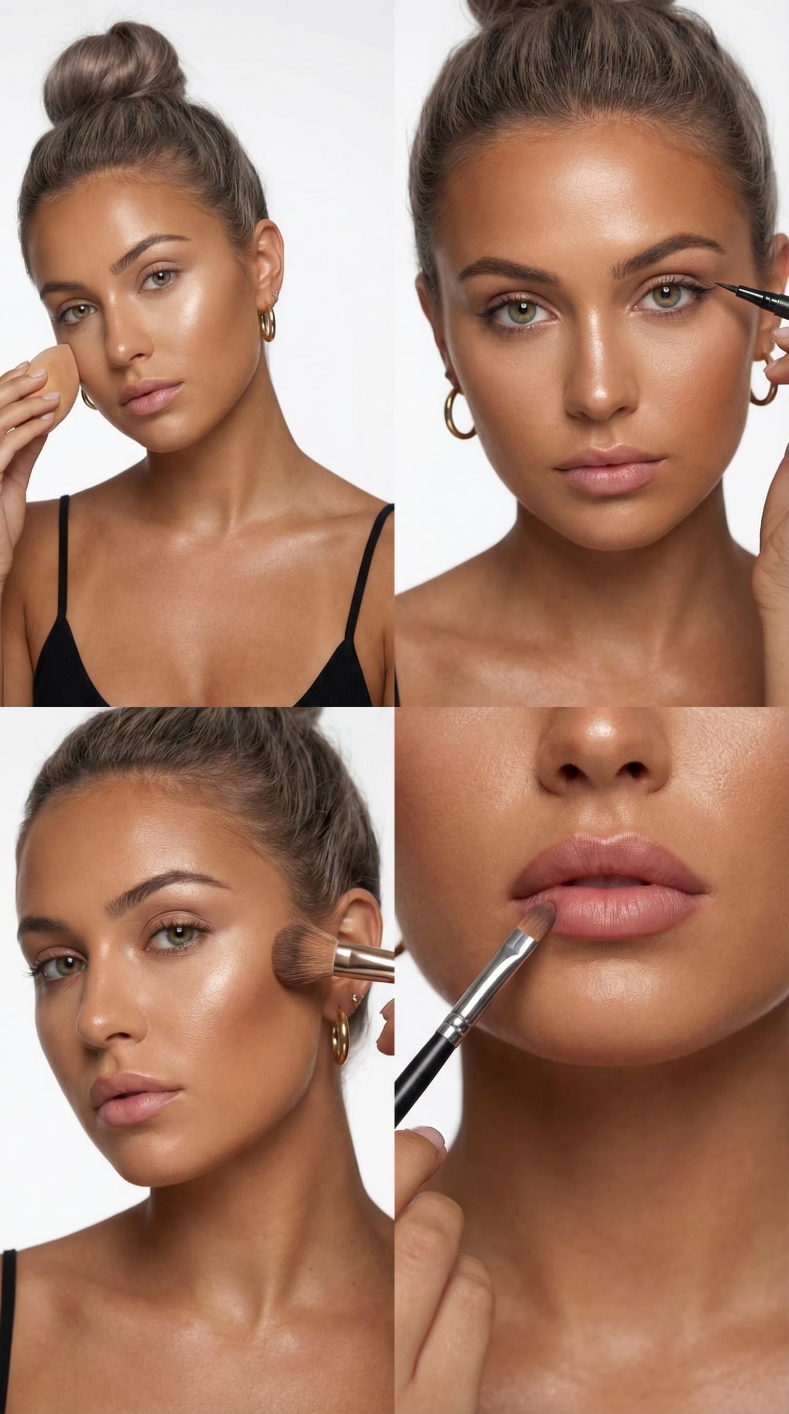 This image portrays the art of makeup application. A woman with her hair in a bun is featured in four vignettes, each...