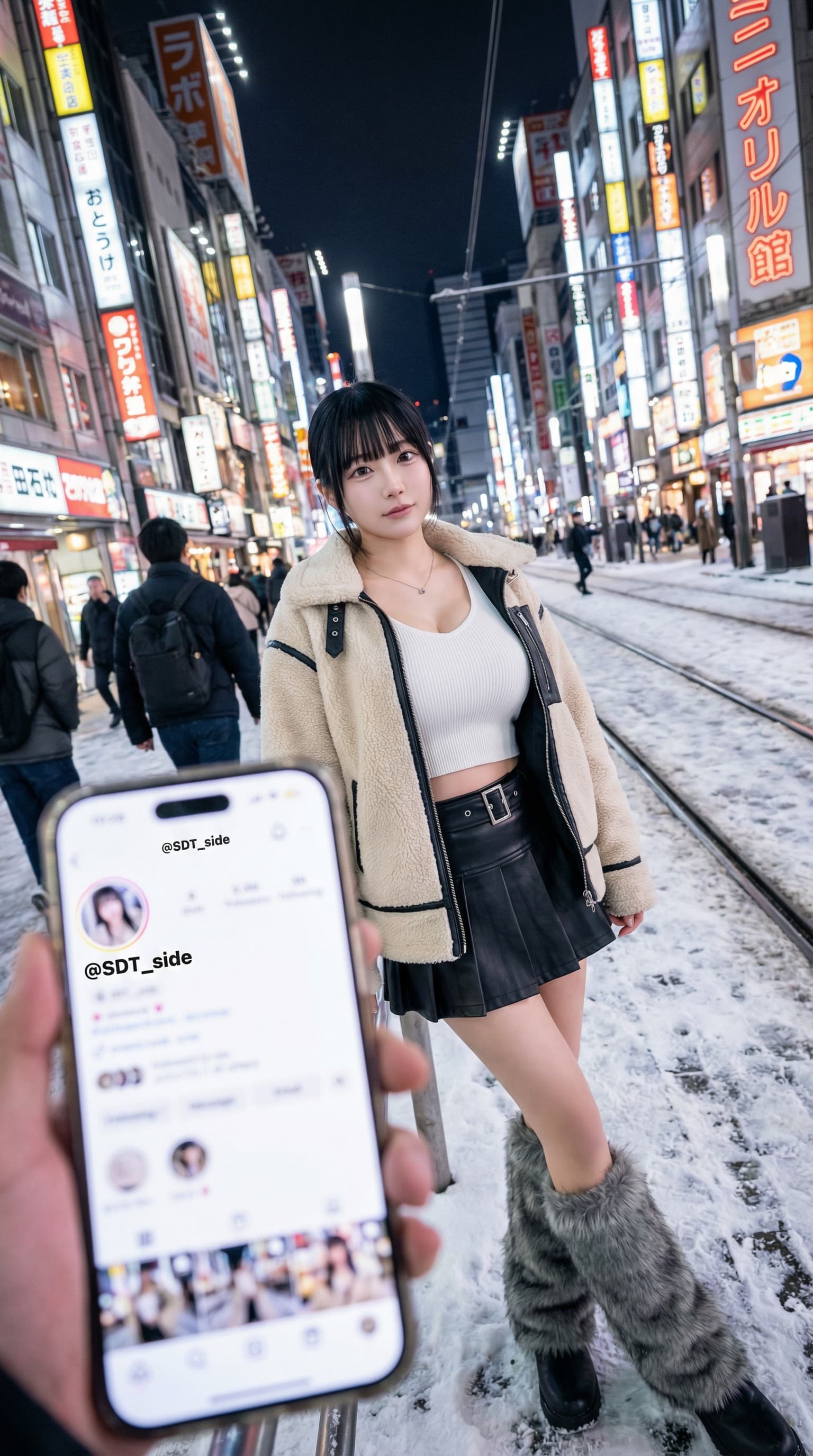 A young woman poses on a snowy street in Japan, amidst bright neon lights and passersby. A hand holds a phone in the ...