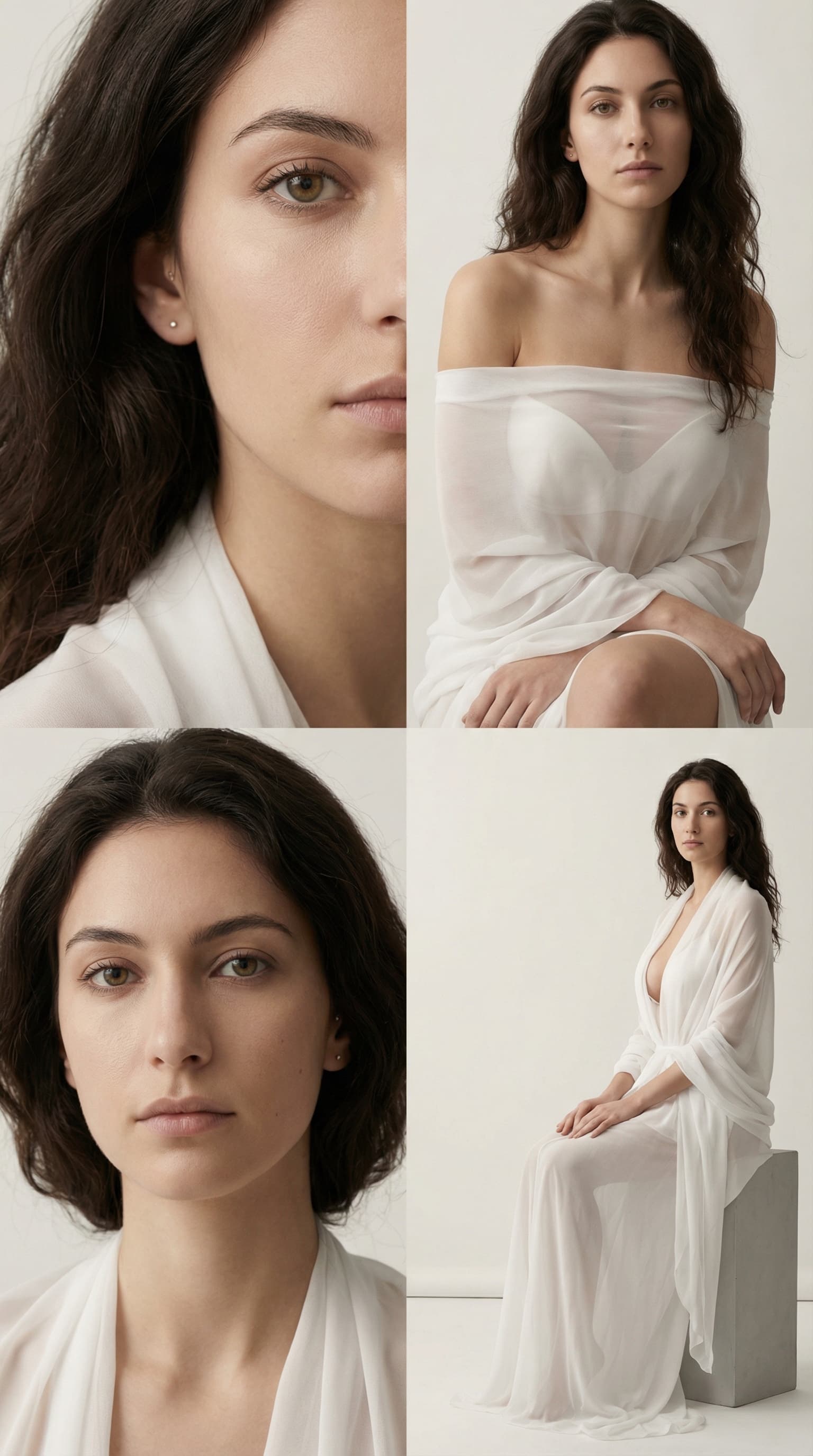This artwork presents a woman in four panels, exploring variations in framing and pose against a minimalist white bac...