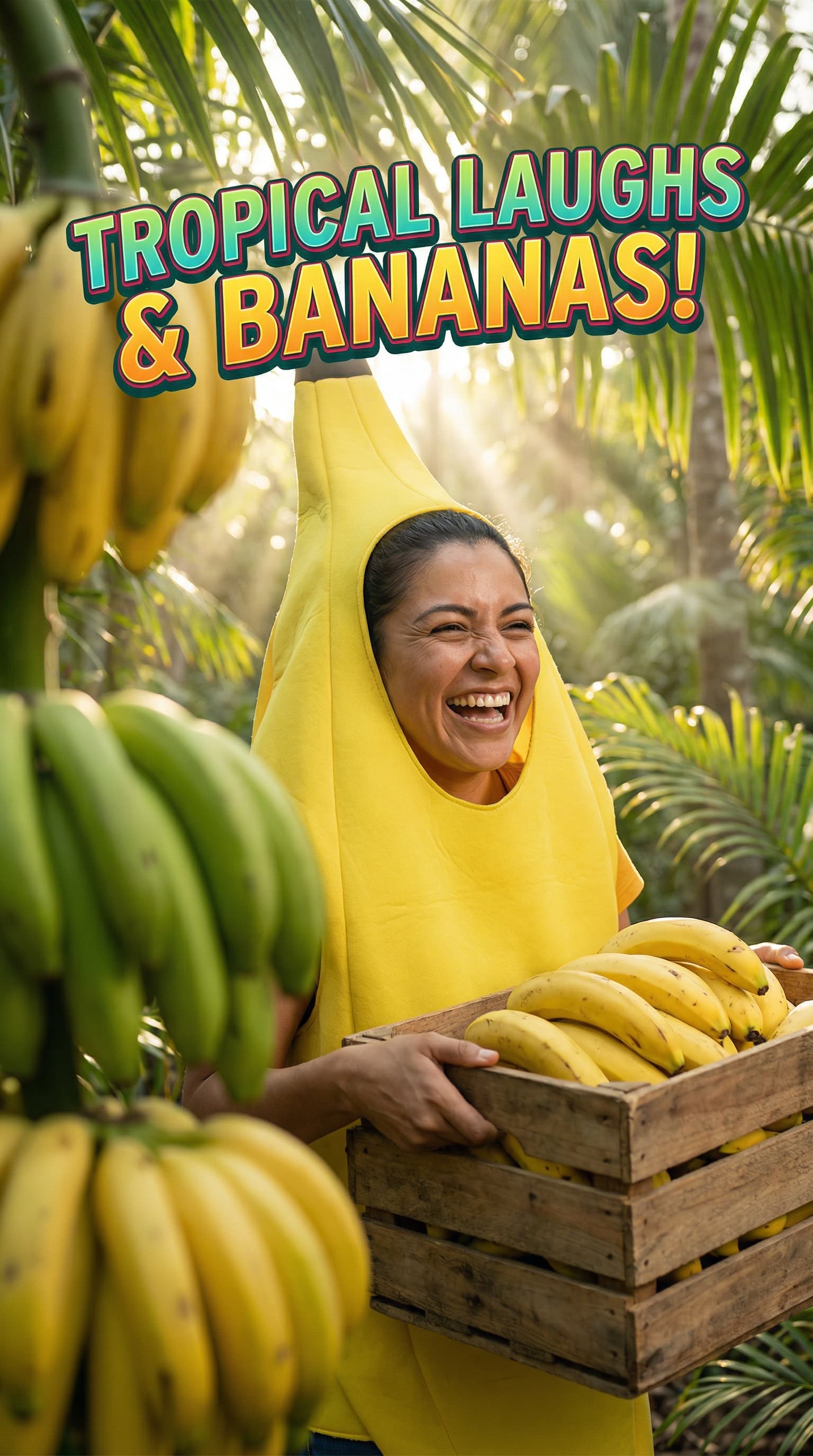 In this lighthearted portrait, a gleeful figure dressed in a banana costume carries a crate overflowing with ripe ban...
