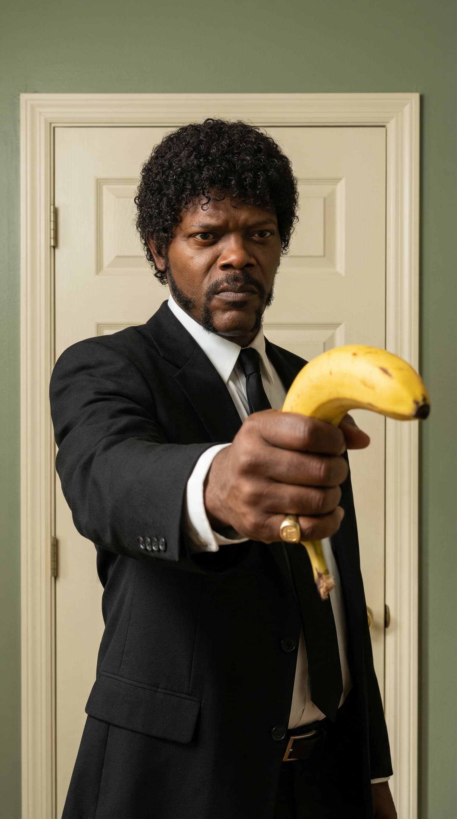 A stern-faced man in a suit points a banana directly at the viewer, creating a moment of unexpected tension. The imag...