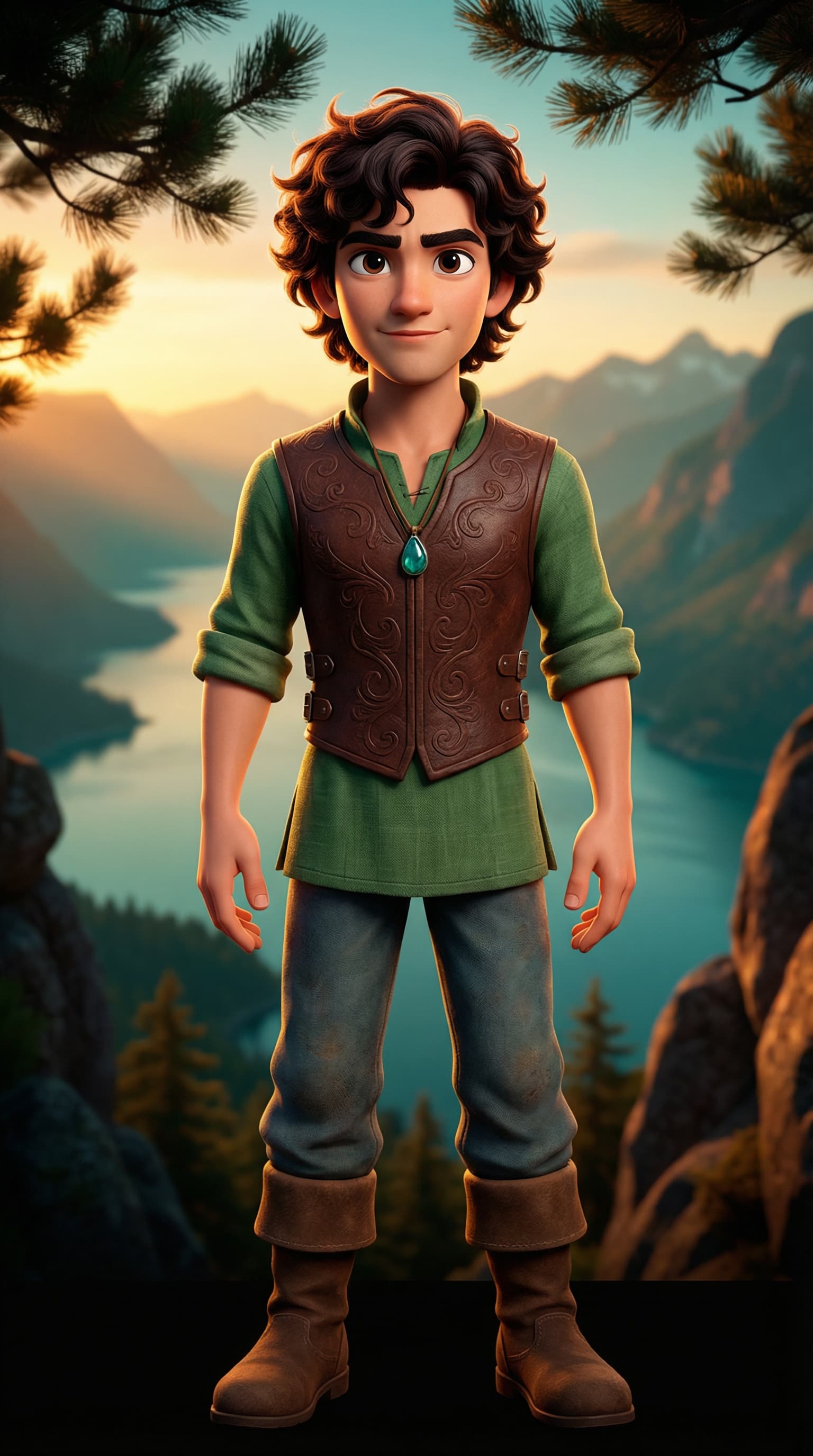 This digital portrait depicts a young man in rustic attire, standing against a picturesque mountain landscape at suns...