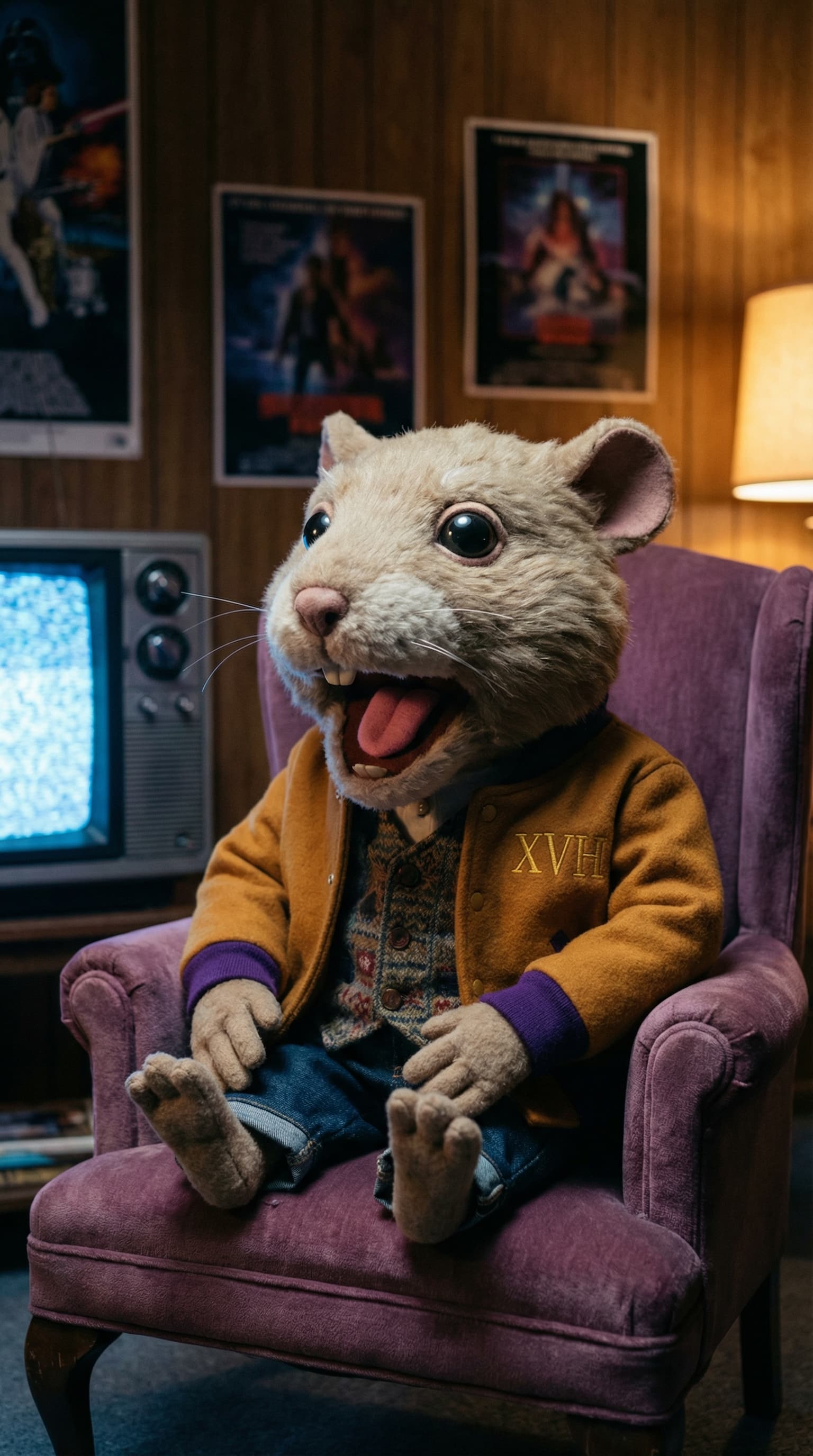 In this anthropomorphic portrait, a mouse-like figure in a letterman jacket relaxes in an armchair. Retro sci-fi movi...