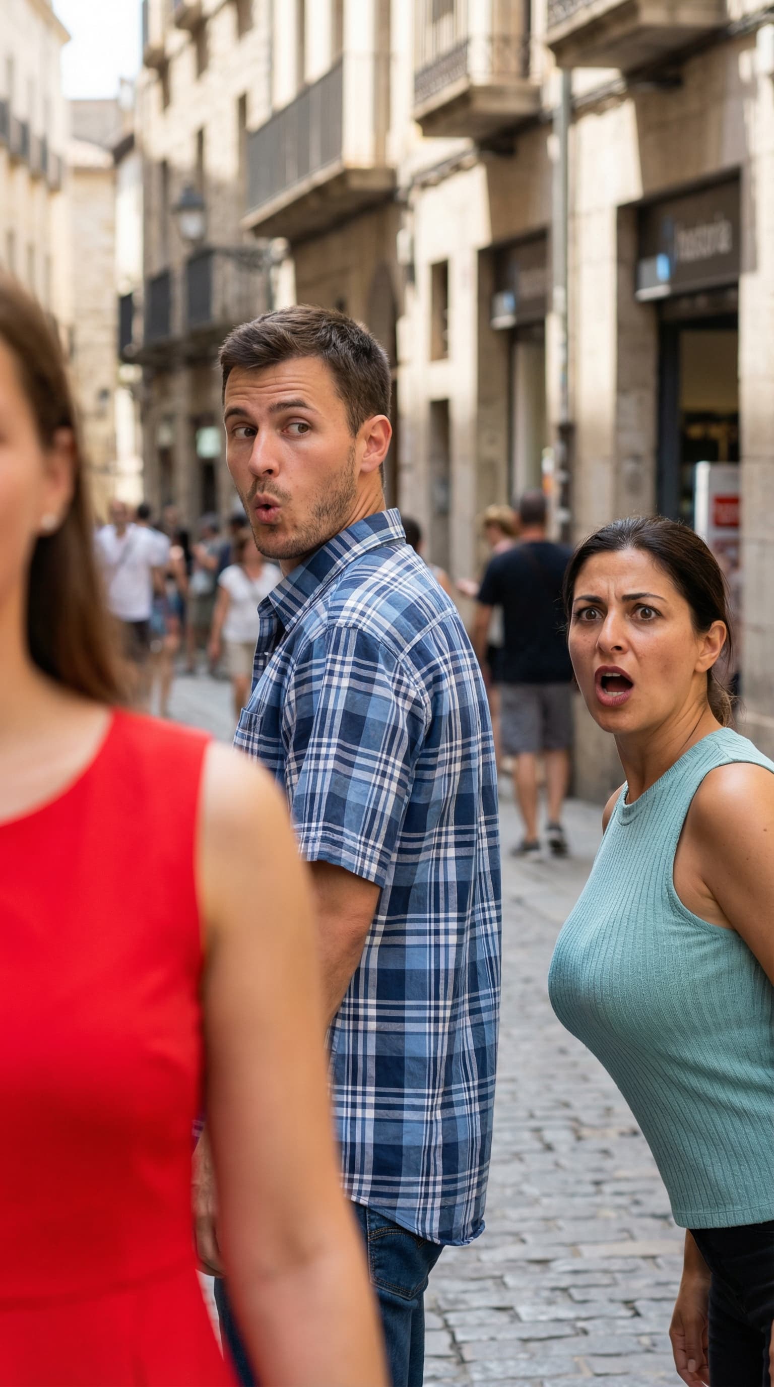This candid image captures a moment of diverted attention on a European street. A man in a blue plaid shirt turns his...