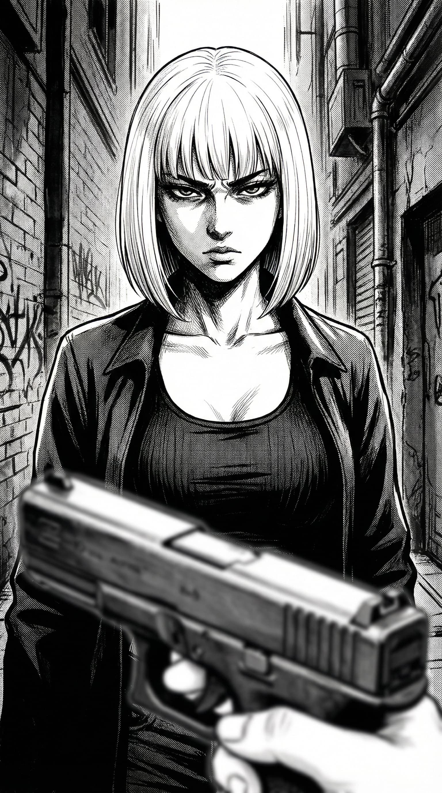 Rendered in a stark black and white comic style, a woman with a cool stare stands in a graffiti-marked alleyway. She ...