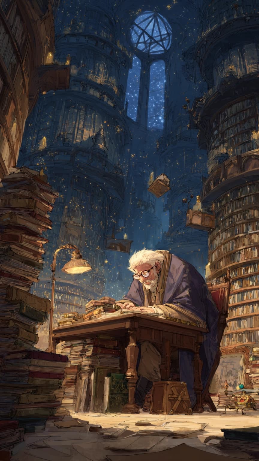 A majestic scholar, an elderly archivist mage, sits at an ancient desk surrounde...